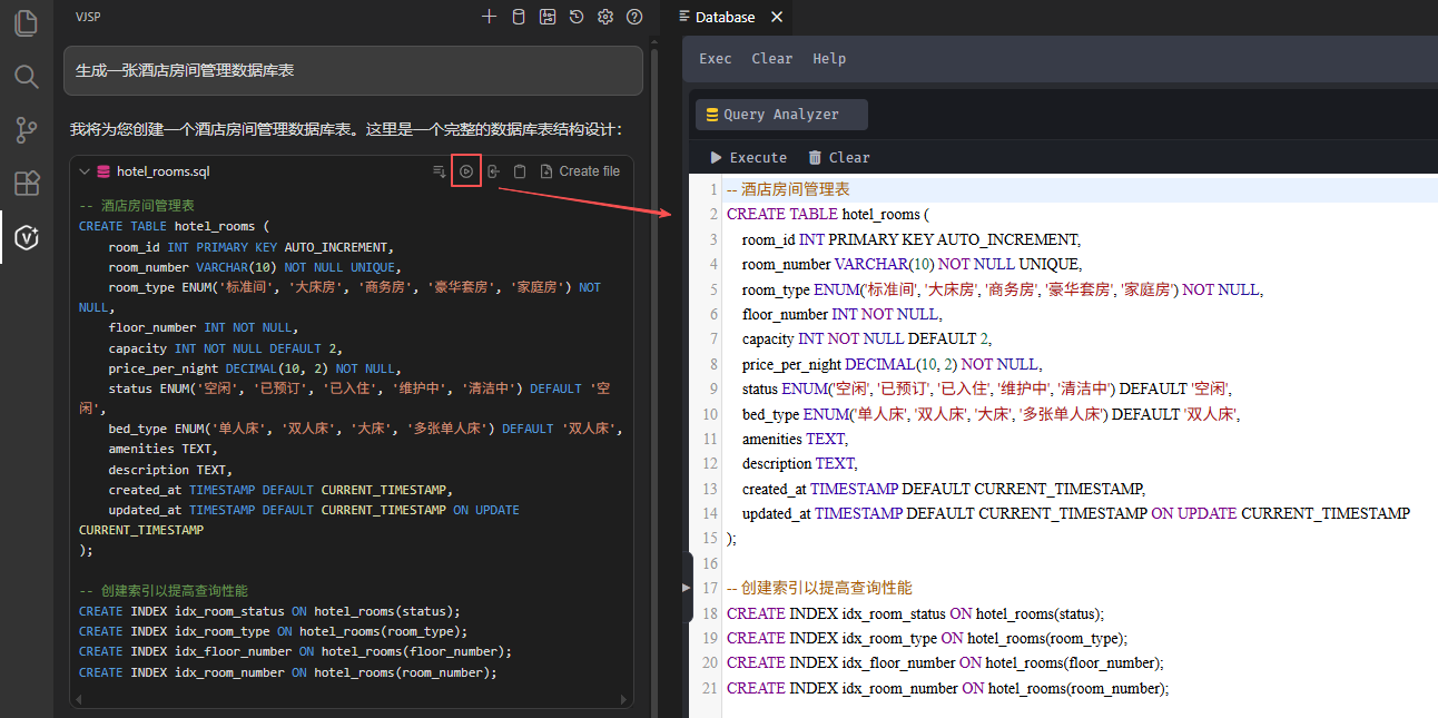 Browse tables, generate SQL via natural language, and execute queries—all within the IDE.