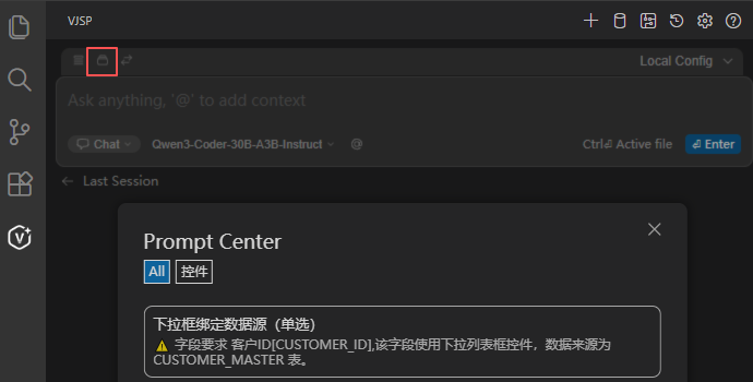 Click the Command Center button to access a library of preset prompts (e.g., “Generate CRUD API”, “Write unit tests”). One click triggers complex AI actions without typing full instructions.