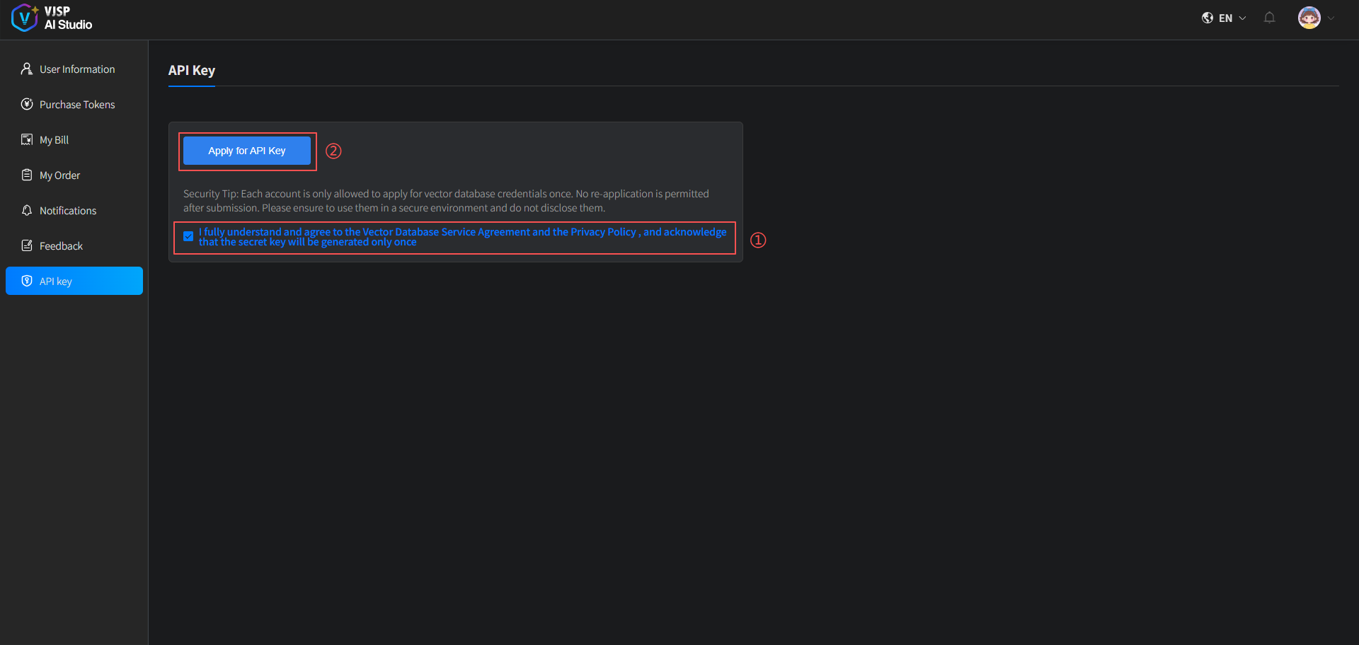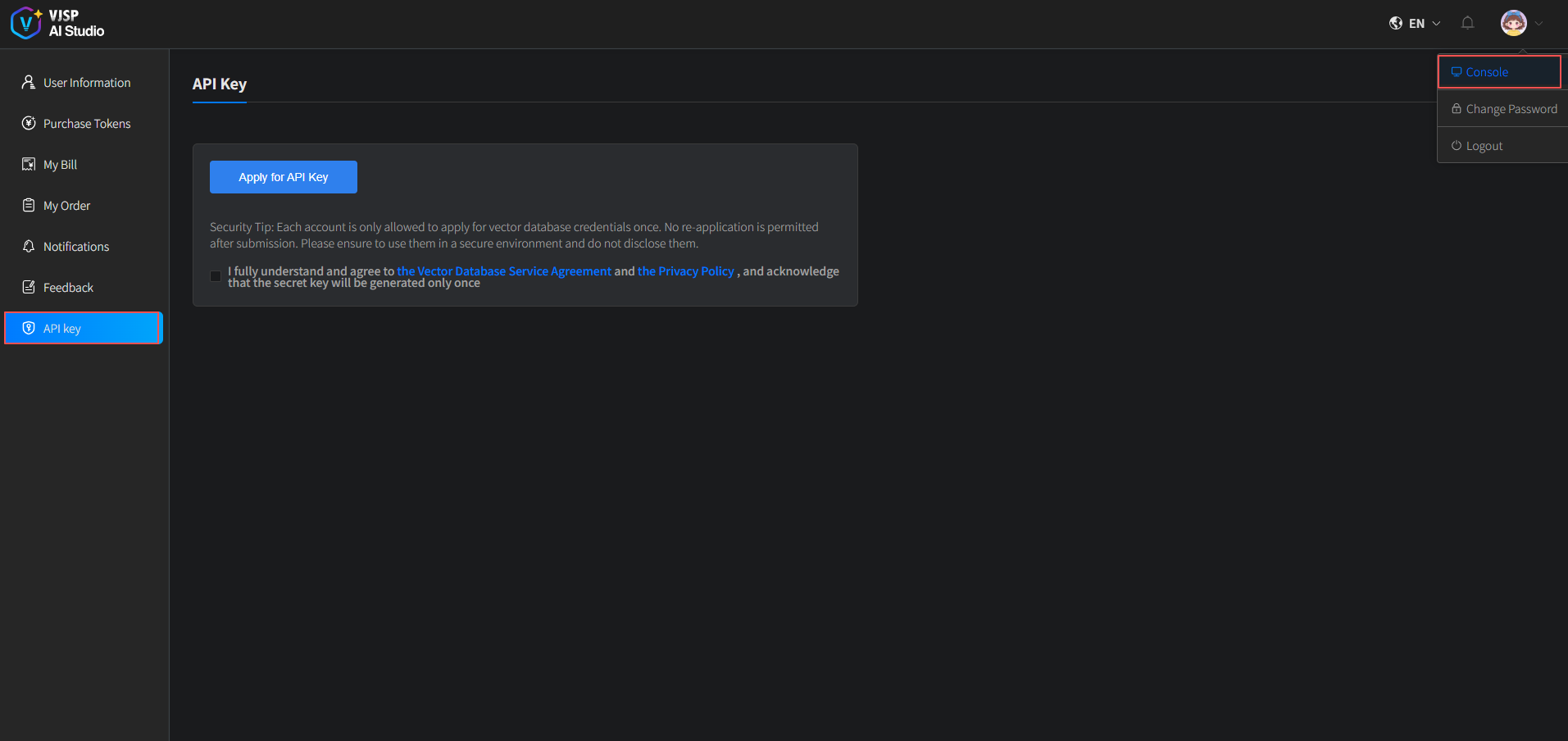 Each account is allowed to apply for a vector database credential only once. Resubmission is not permitted after submission. Please ensure it is used in a secure environment and do not disclose it.