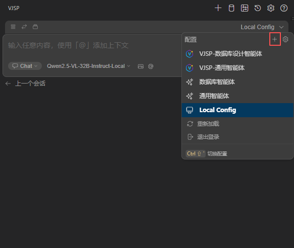 Agents are programming assistants tailored for different development scenarios. VJSP Assistant offers many ready-to-use agents that you can add from Agent Hub. You can also create custom agents—by flexibly adjusting prompts and toolsets—to help you accomplish complex tasks more efficiently. For details, see Local Agents.