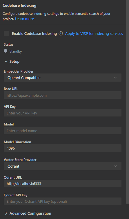 The Qdrant exclusive URL and API key must be applied for through the VJSP Official Website Console. After successful application, copy the relevant information to the corresponding configuration items of Codebase Indexing. For detailed acquisition steps, refer to the corresponding help documentation.