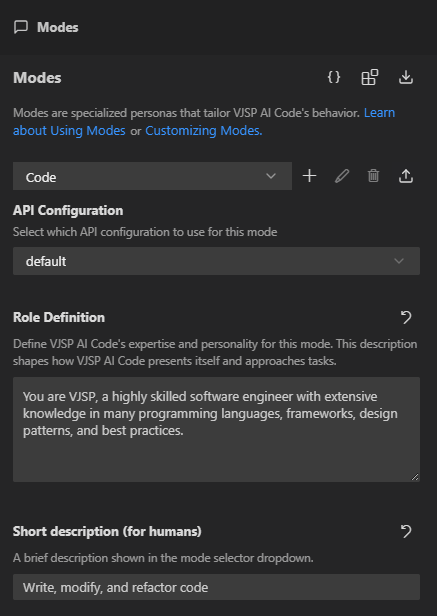 Custom Instructions (customInstructions) | (Optional) Additional behavioral guidelines specific to the mode, appended to the end of the system prompt to further refine VJSP’s logic. |