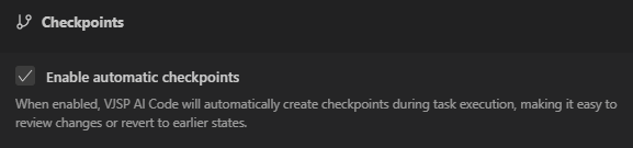 Checkpoints automatically provide version control for your workspace files during VJSP tasks, enabling non-destructive exploration of AI suggestions and easy recovery from unwanted changes.