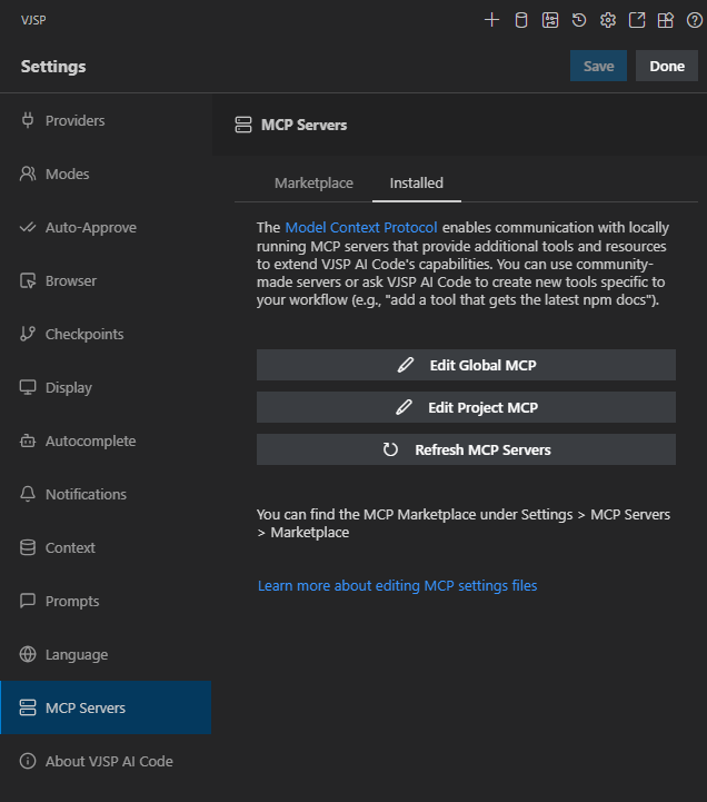 - Ask VJSP: You can ask VJSP to help you find or even create an MCP server (when "Enable MCP Server Creation" is enabled).