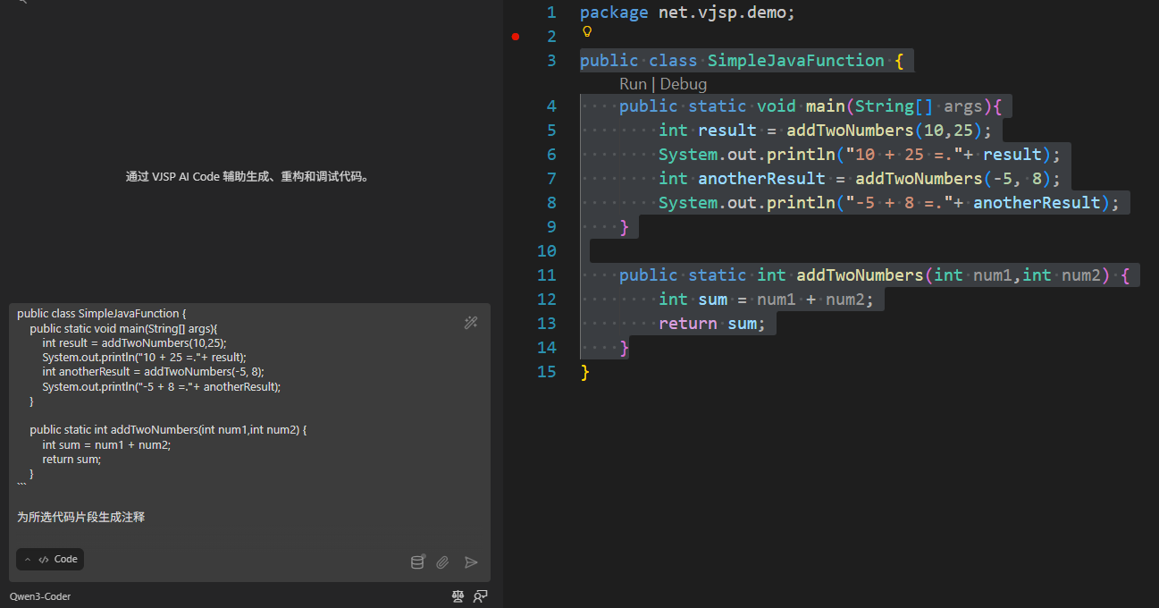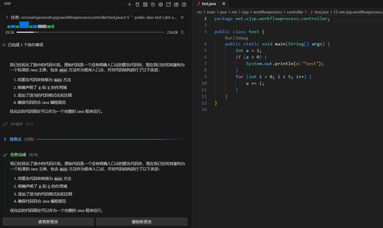 VJSP Assistant can edit selected code—supporting refactoring, optimization, logic modification, and more—based on natural language instructions. Follow these steps: