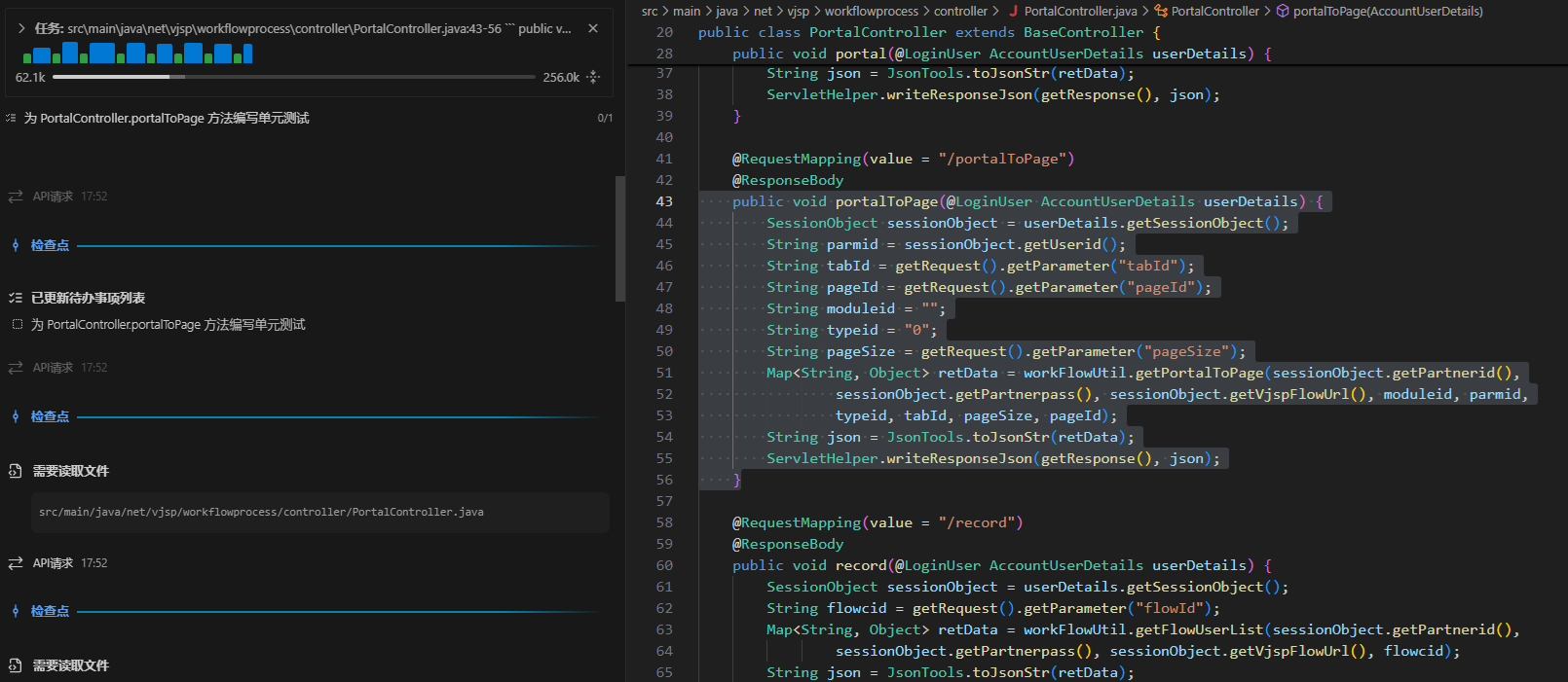 After selecting a code snippet, send a unit test generation command to VJSP Assistant. It will generate appropriate unit tests for the selected code.