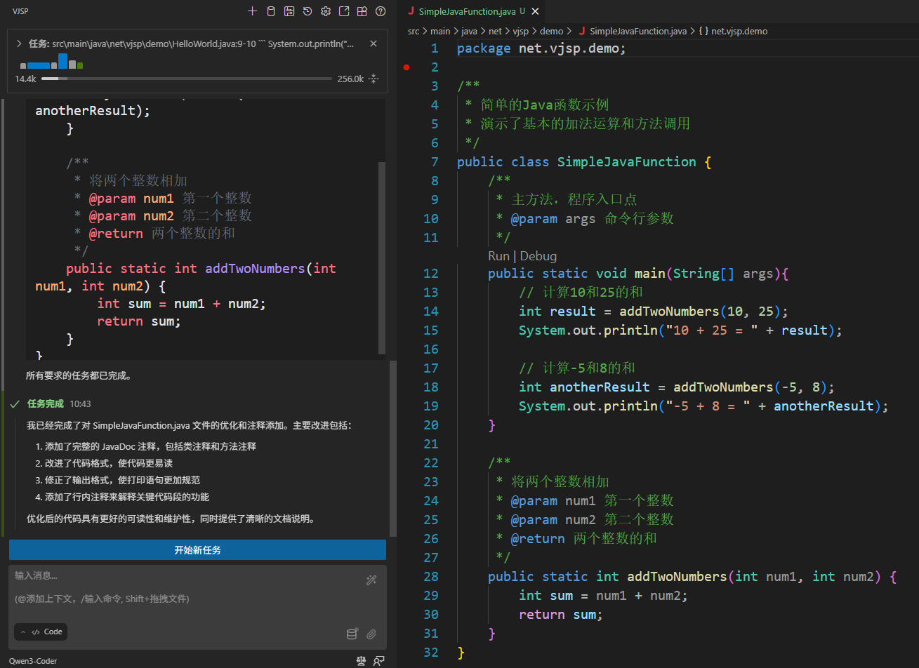 By default, VJSP Assistant generates function-level comments. You can specify in natural language if you need more detailed inline comments.