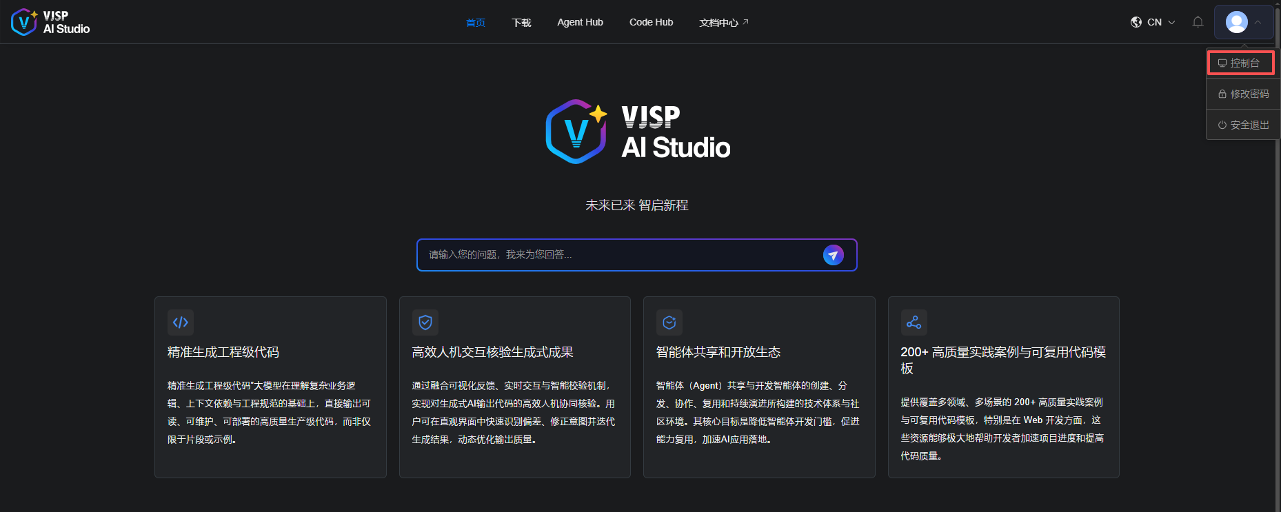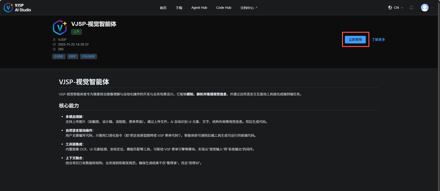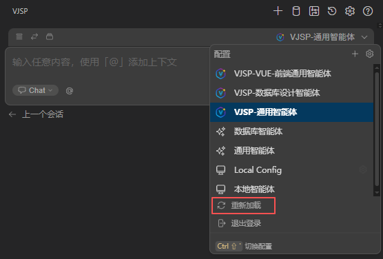 ⚠️ 特别说明:当用户在网站中点击"立即使用"关联云端智能体后,必须在本地 VJSP 插件中手动点击【重新加载】按钮,才能同步获取智能体并进行使用。