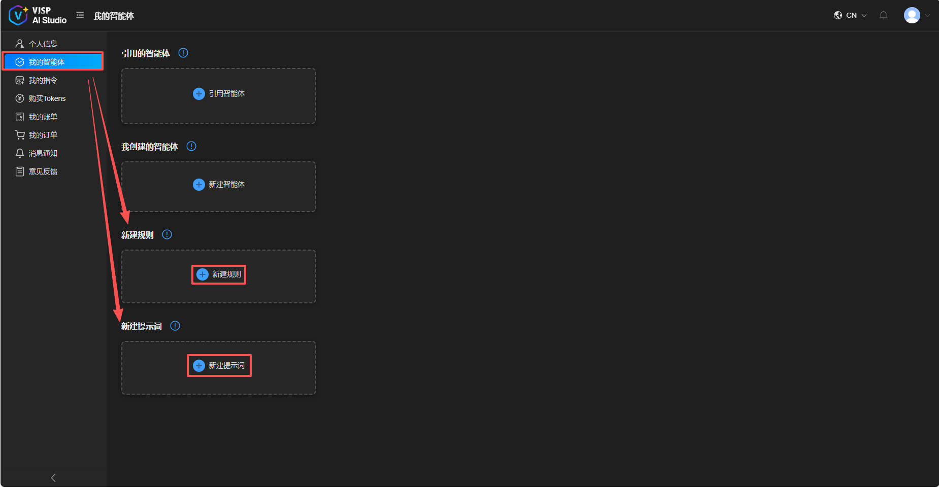 特别说明:智能体所关联的“规则”、“提示词”可在 Agent Hub 页面选择,或在“我的智能体”页面创建。