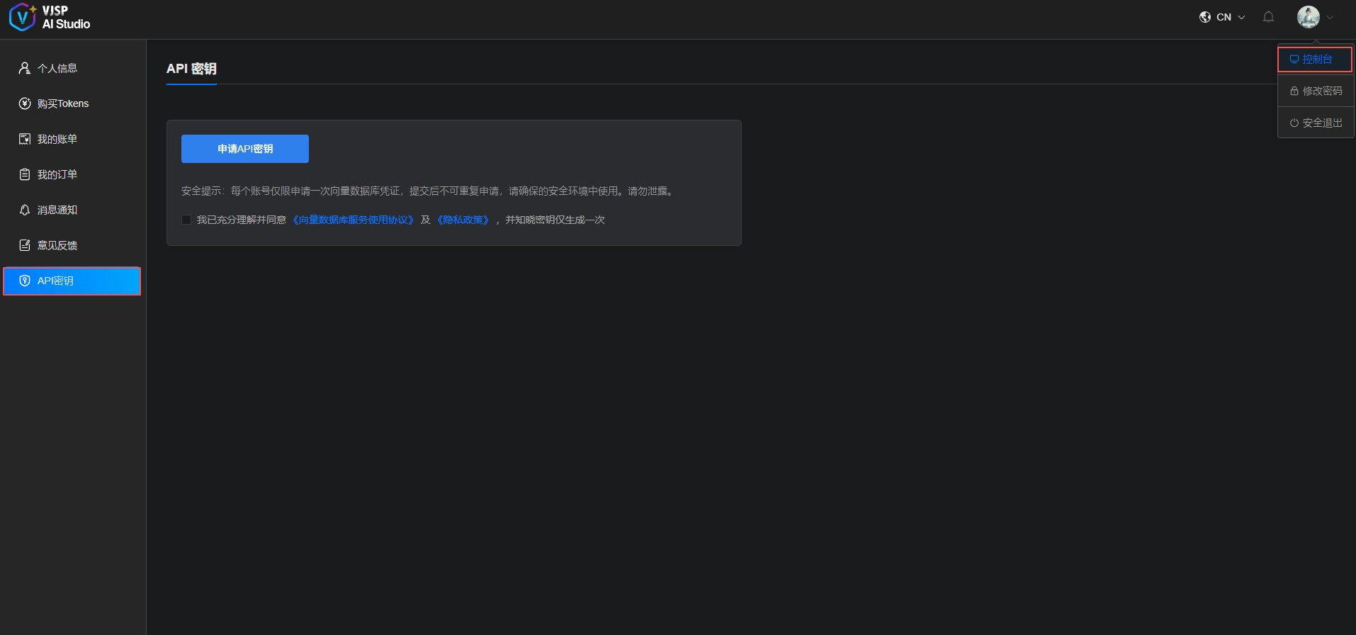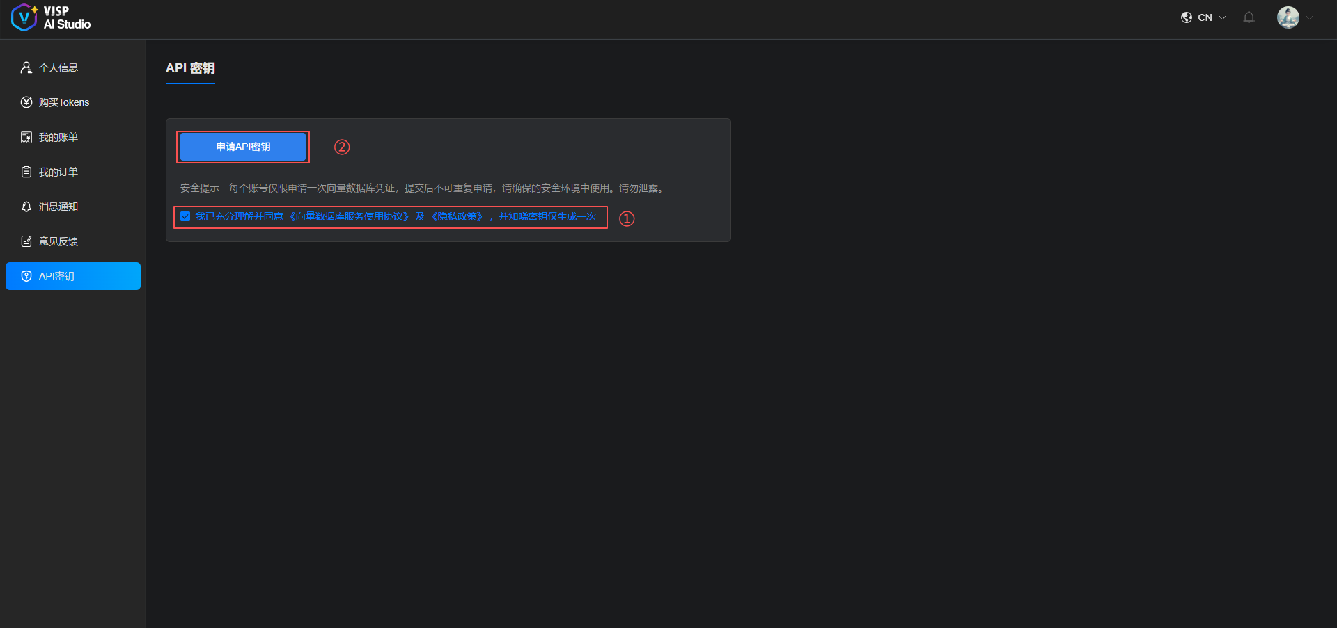 每个账号仅限申请一次向量数据库凭证,提交后不可重复申请,请确保的安全环境中使用。请勿泄露。