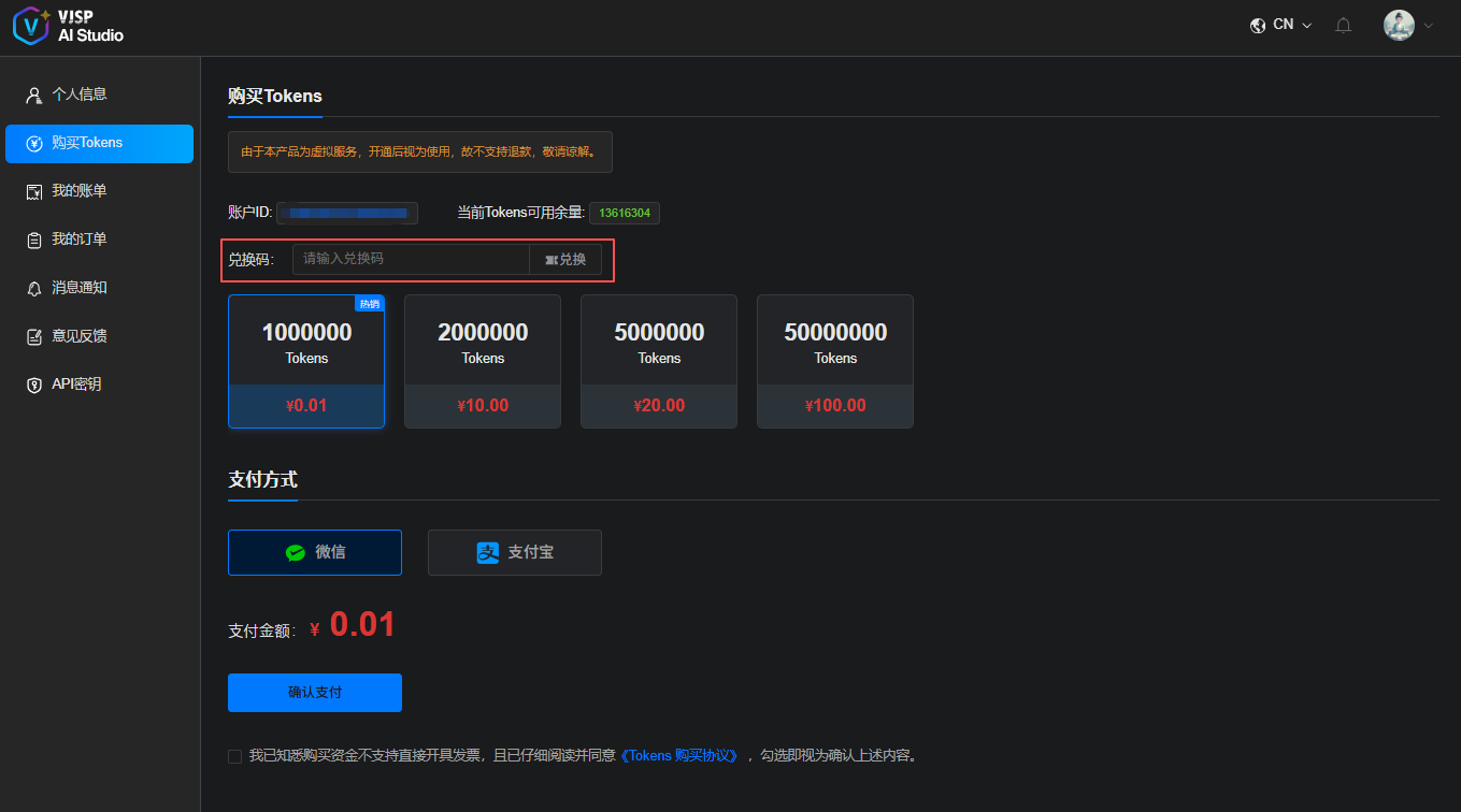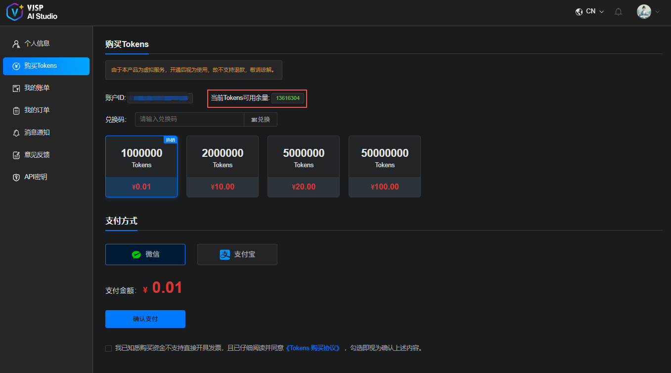 在该页面您可进行【Tokens余量查看】、【兑换Tokens】、【购买Tokens】操作。