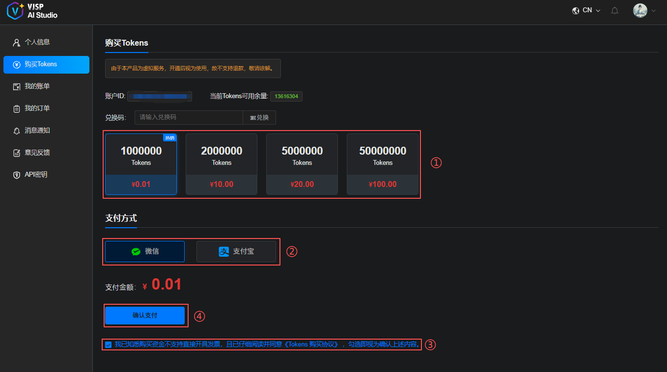 控制台 → 左侧导航栏【购买Tokens】