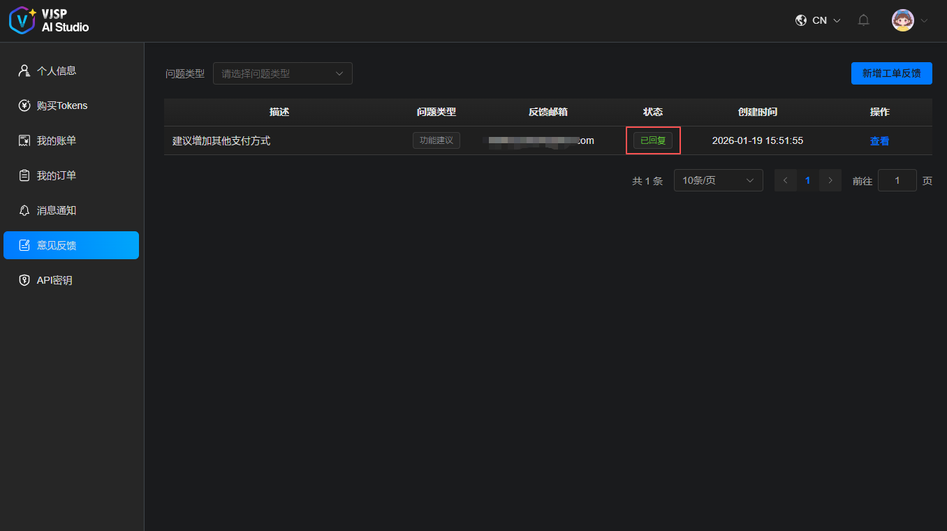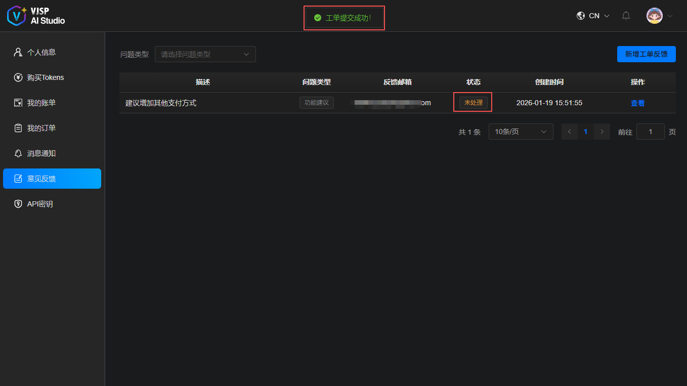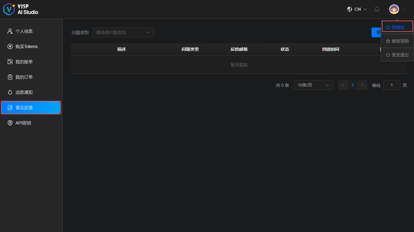 控制台 → 左侧导航栏【意见反馈】