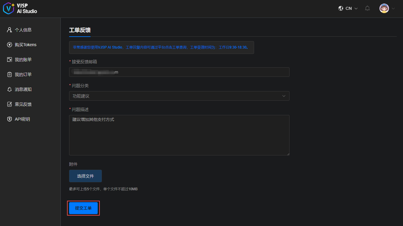 填写反馈信息,点击【提交工单】。