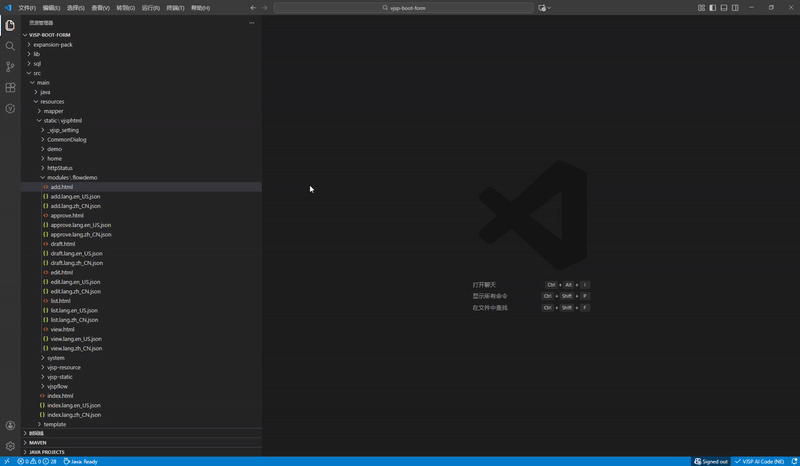 - 在 IDE 中打开一个项目,为了更好的体验 VJSP助手 的功能,现提供不同框架的源码,可前往 Code Hub 下载使用。