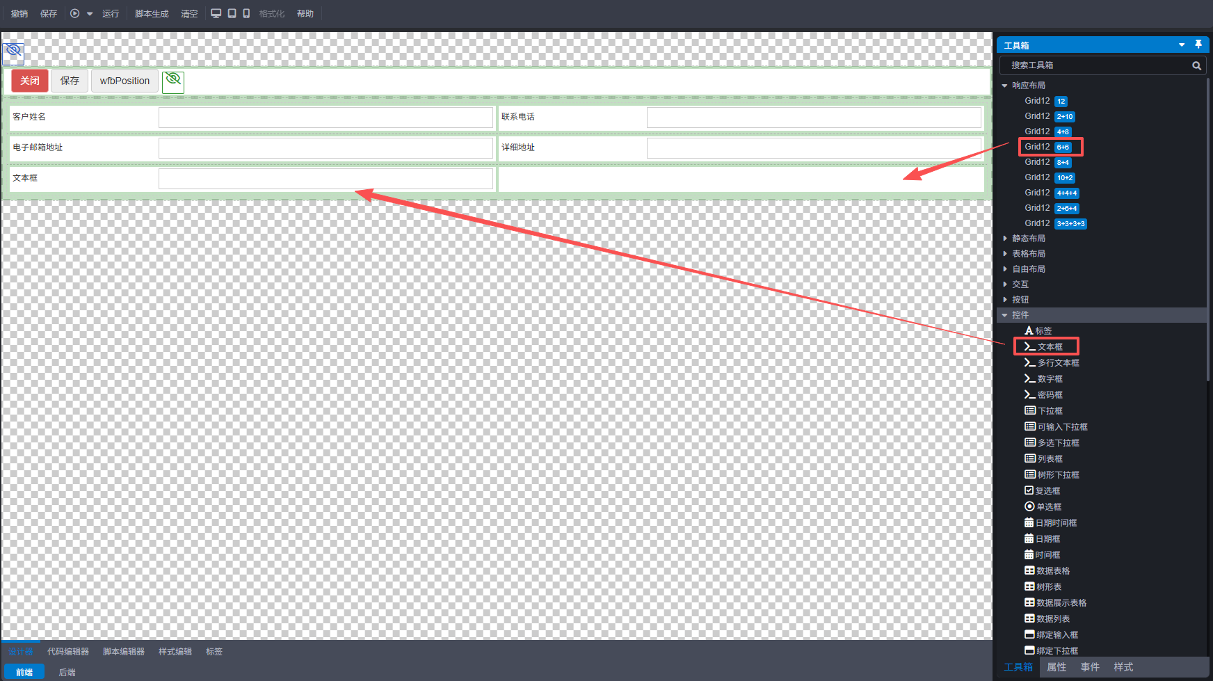 操作如下:工具箱响应布局选择‘6+6布局’,控件选择‘文本框’,拖动至表单编辑区域,效果图如下: