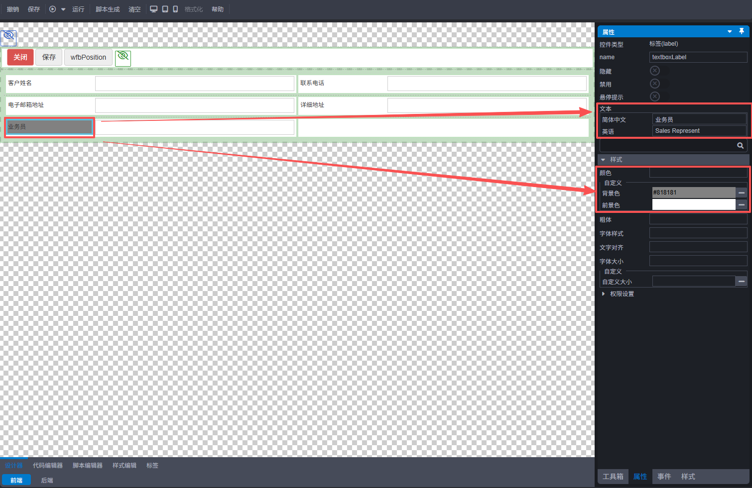 操作如下:点击标签,右侧出现属性面板,在文本位置将‘文本框’修改为‘业务员’;在样式中将背景色设置为灰色,效果图如下: