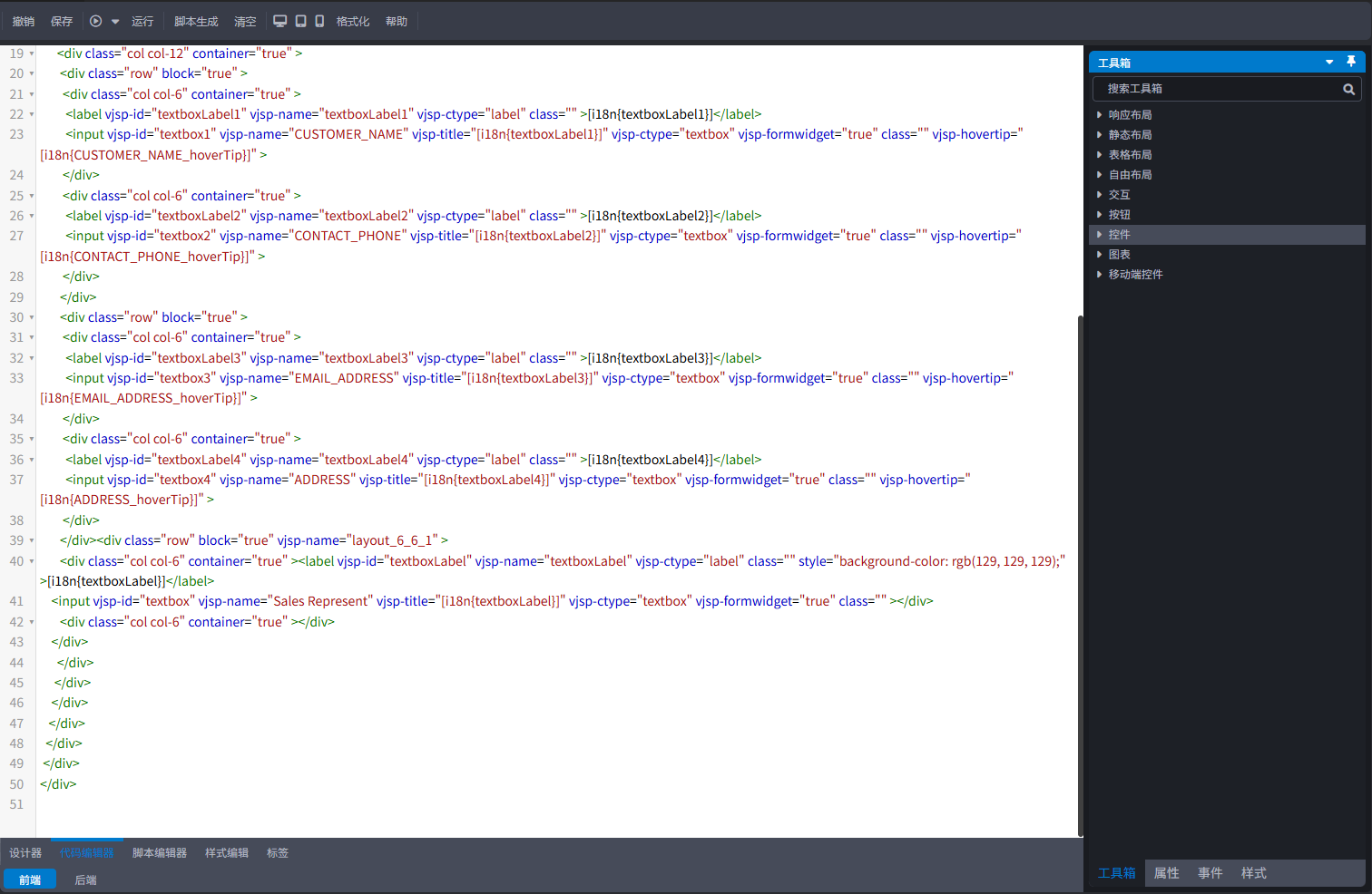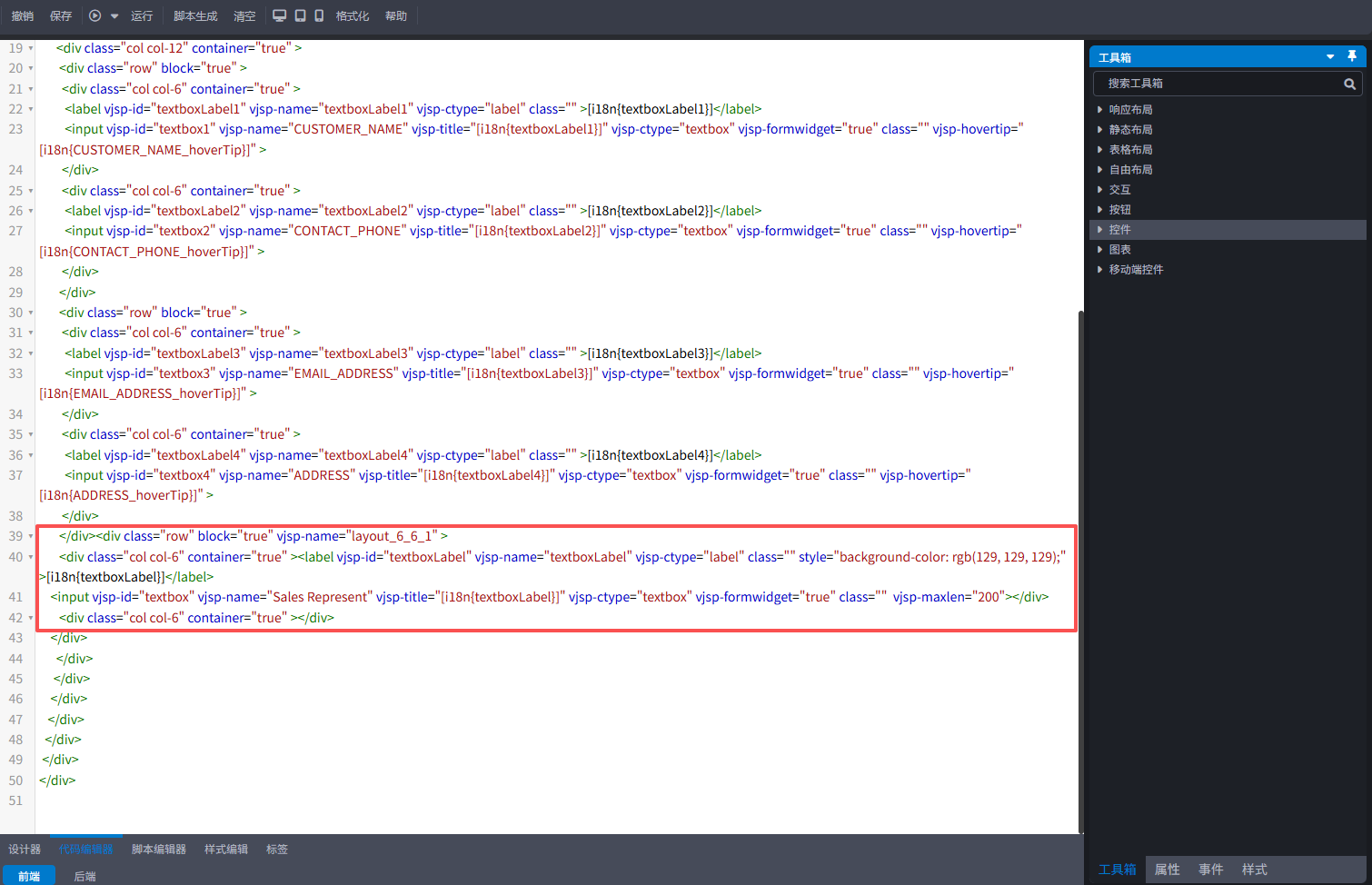 在编辑区域选中控件,设置控件的属性、样式、权限设置。
