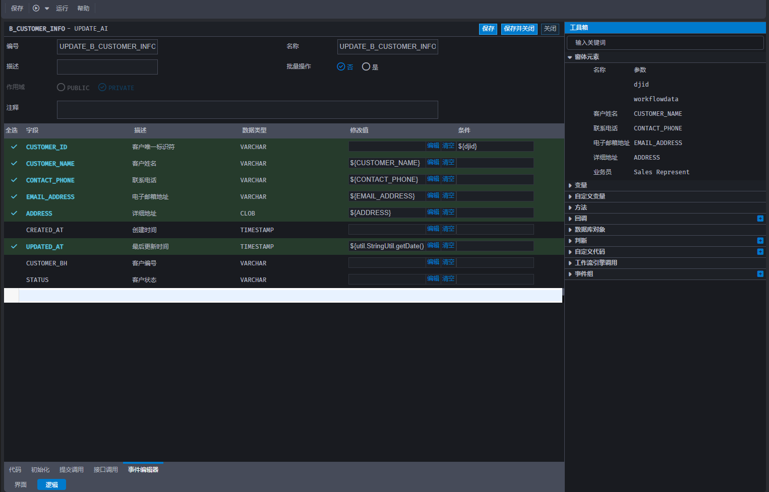 点击后端,进入后端编辑,在‘提交调用’页选择一个事件以进入其编辑器,在事件编辑器中,从右侧工具箱选择并拖动至对应位置,即可完成后端逻辑编写,效果如下图: