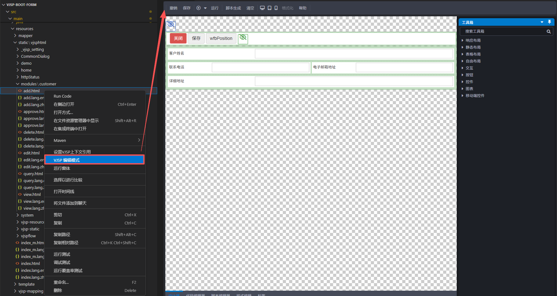 在项目文件列表中,找到需要预览的 HTML 表单文件,右键点击该文件,在弹出的菜单中选择【VJSP编辑模式】选项,系统会自动打开表单前端预览窗口,实时展示表单的页面样式、交互效果及字段布局,便于开发者快速调整表单设计。