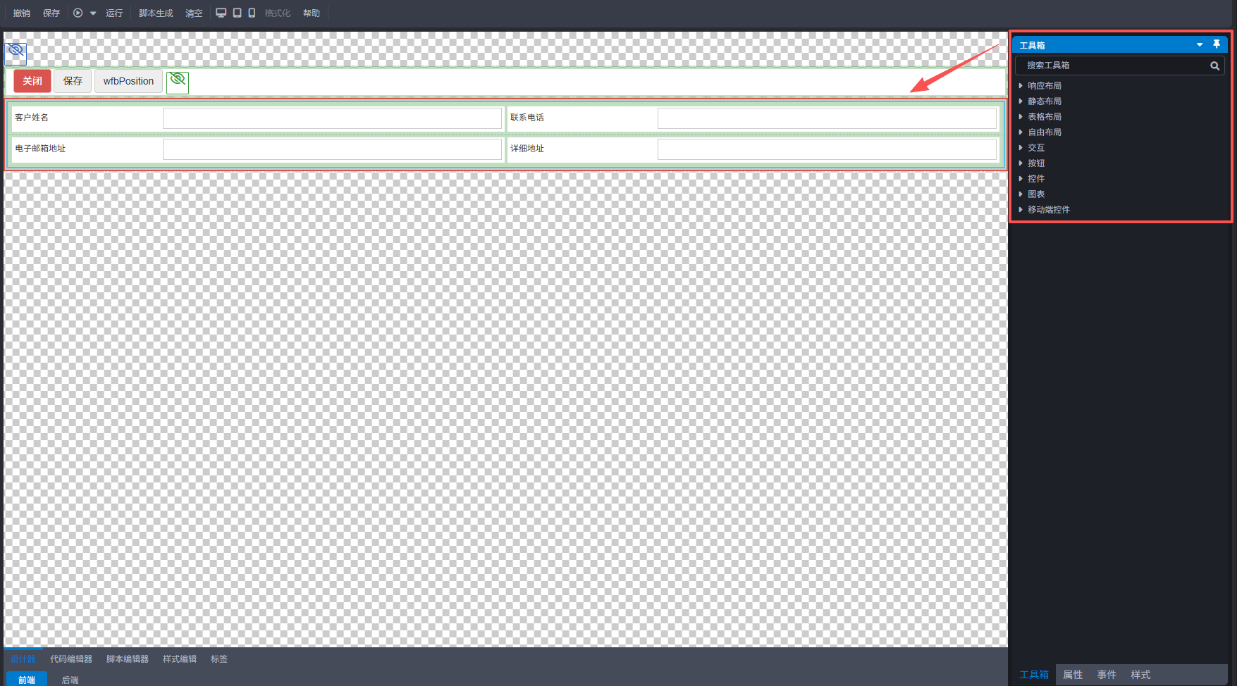 在工具箱内选择工具,拖动工具至设计器内,编辑表单页面样式页面。