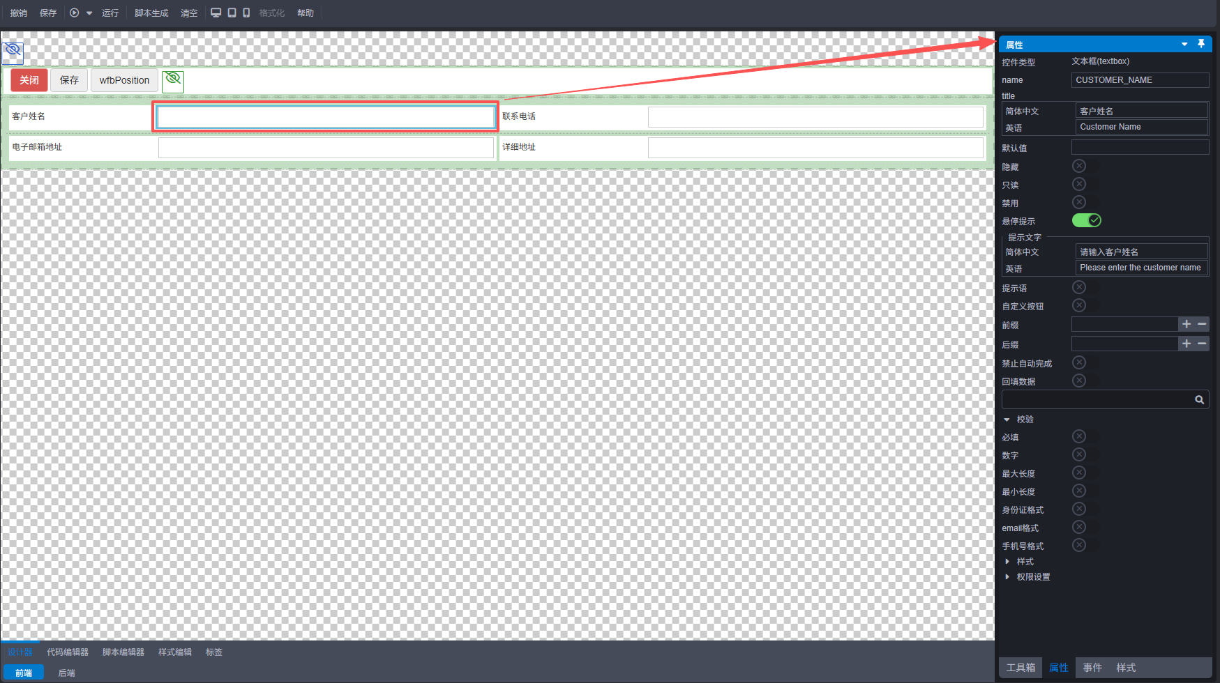 点击设计器内组件,右侧打开属性页面,可设置组件属性。
