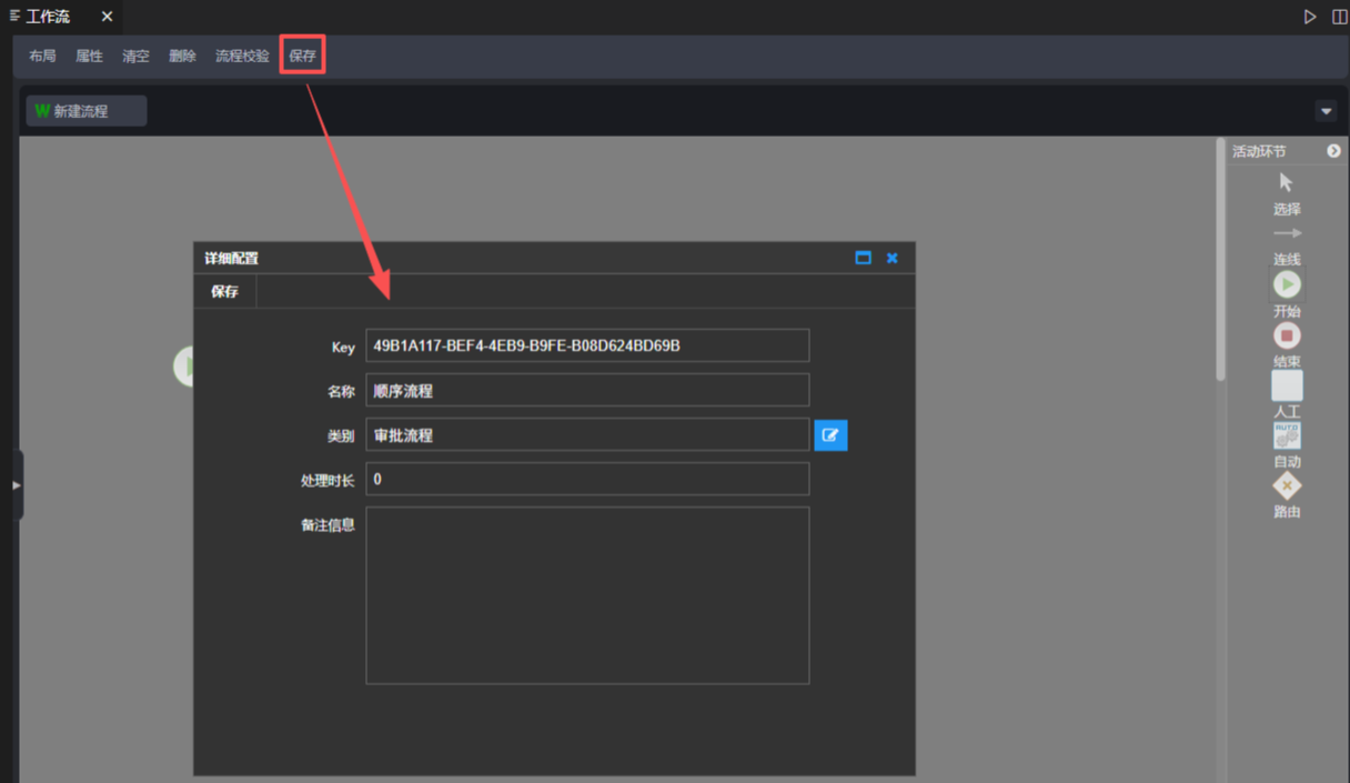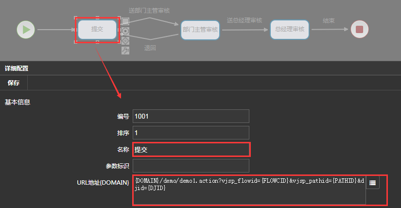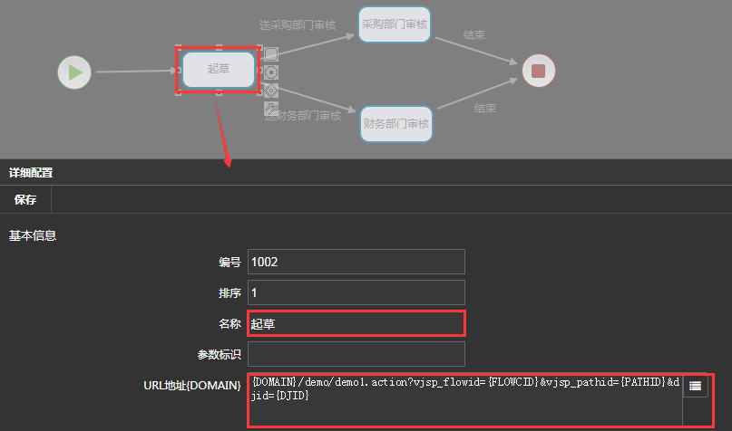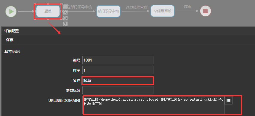 新建流程后,窗体设置绑定流程,进入流程设置页面,点击流程控件拖拽到页面形成流程,双击控件名称,修改名称,右击【起草】人工控件,点击【详细配置】,在详细配置页面,设置URL地址和审批送出设置,点击【保存】,如下图: