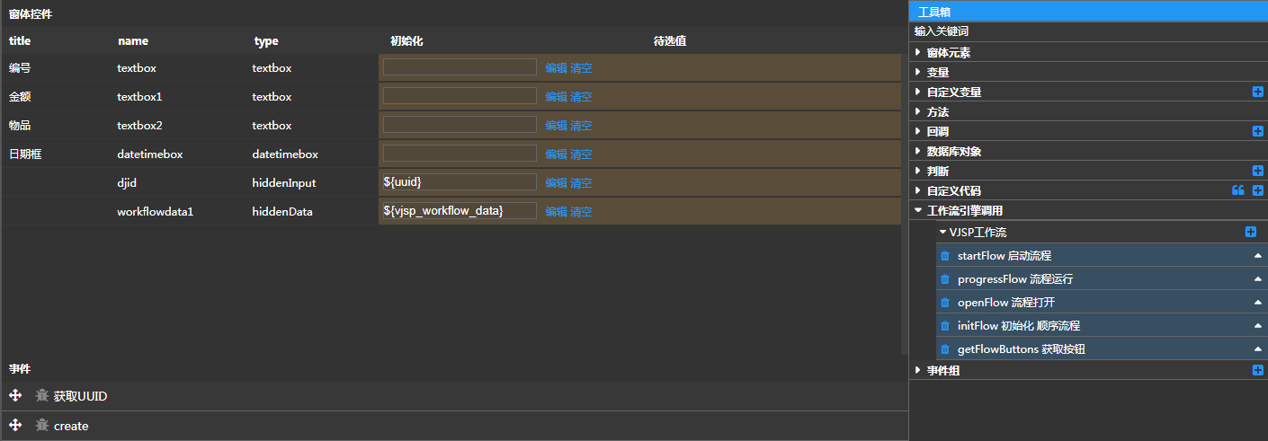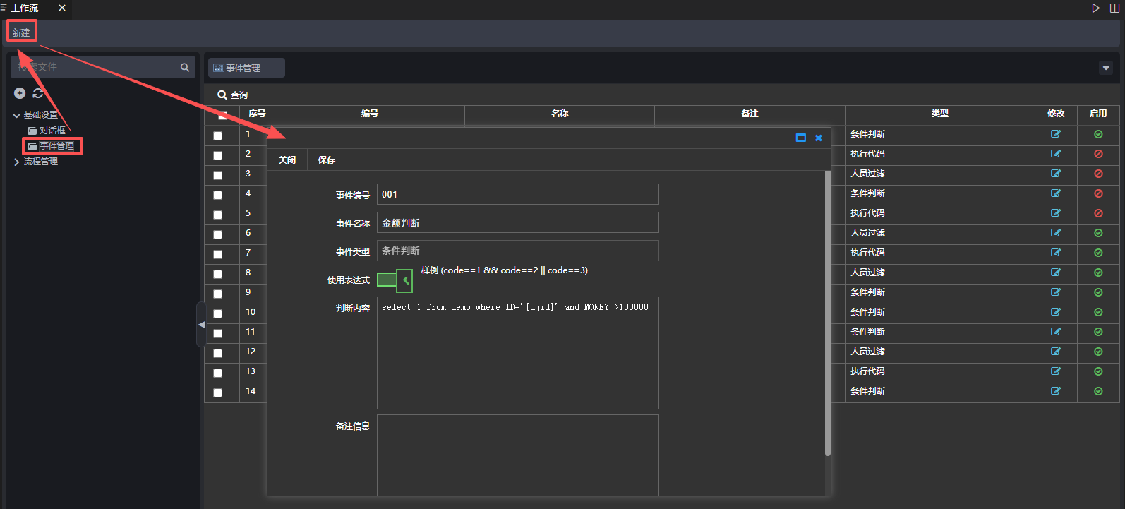 在【事件管理】中新建针对窗体金额条件判断的事件,如下图: