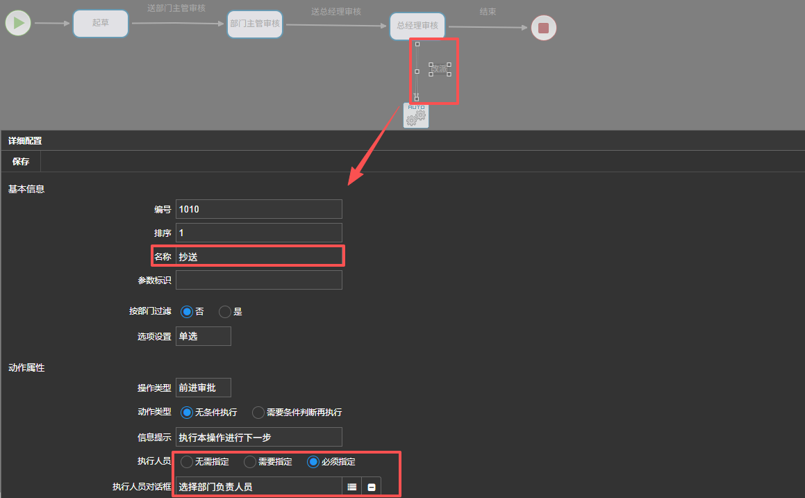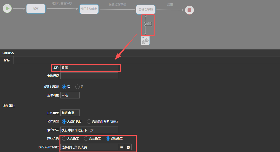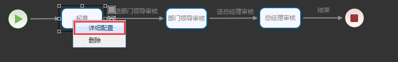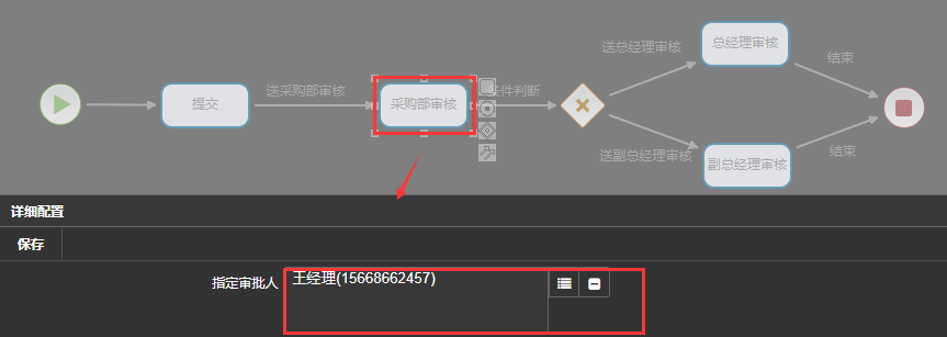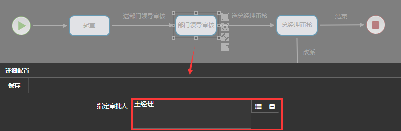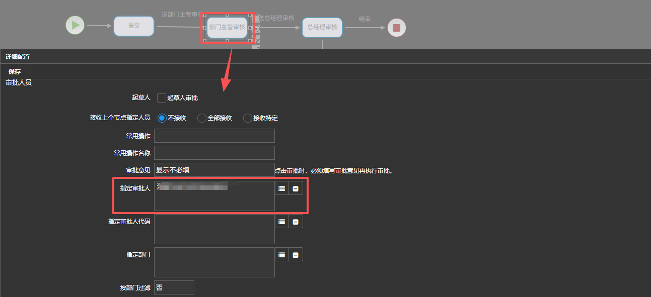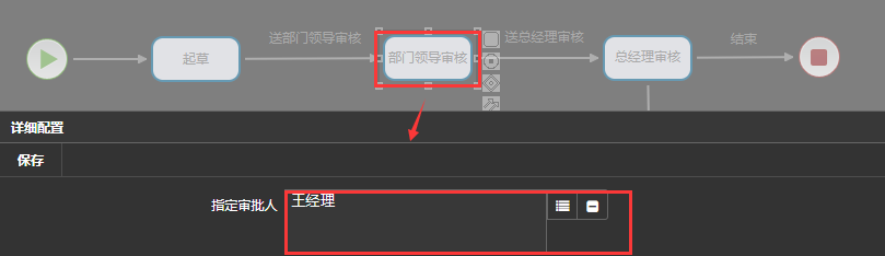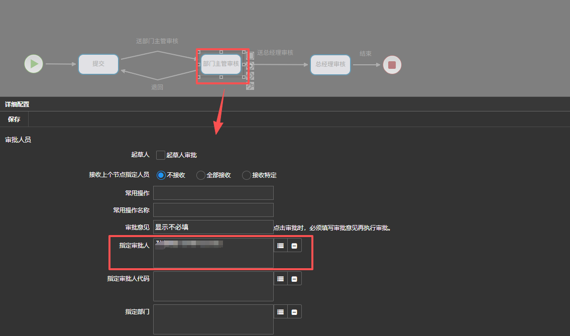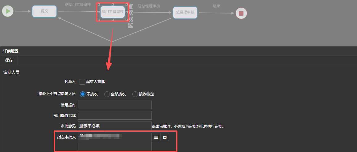 设置人工控件(节点)的审核人员,右击“部门领导审核”节点,点击【详细配置】,进入详细配置页面,选择审批人员,“总经理导审核”节点也如此设置,如下图: