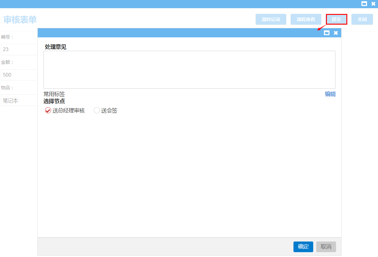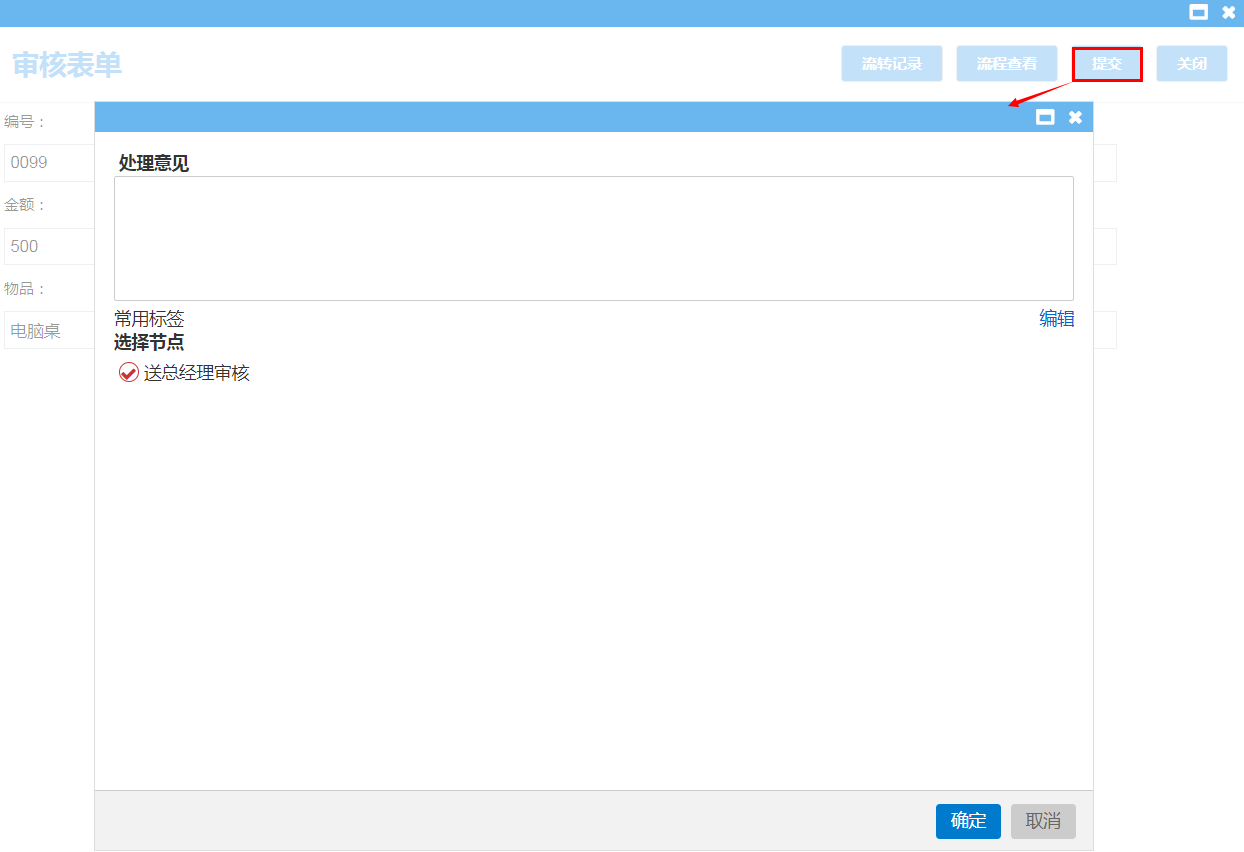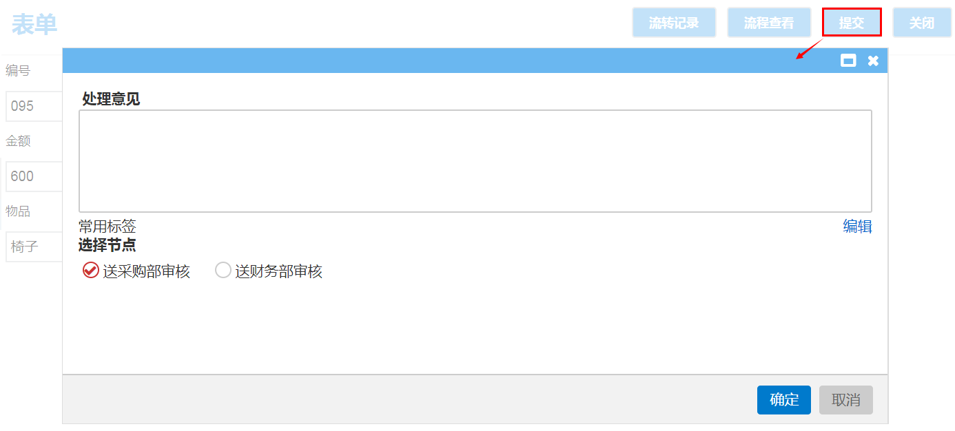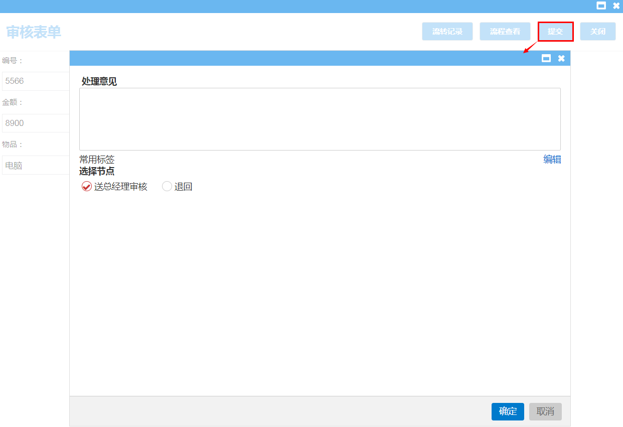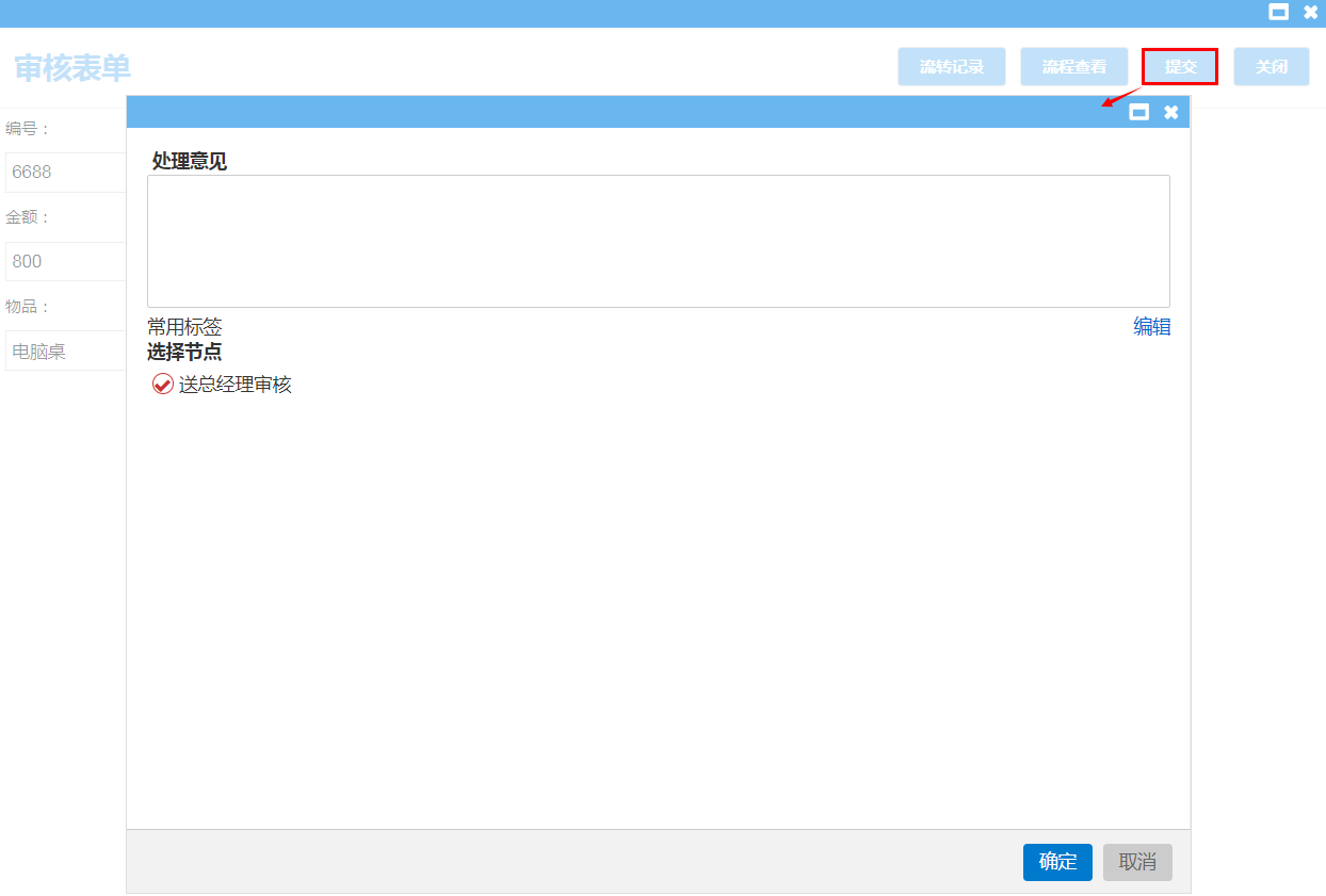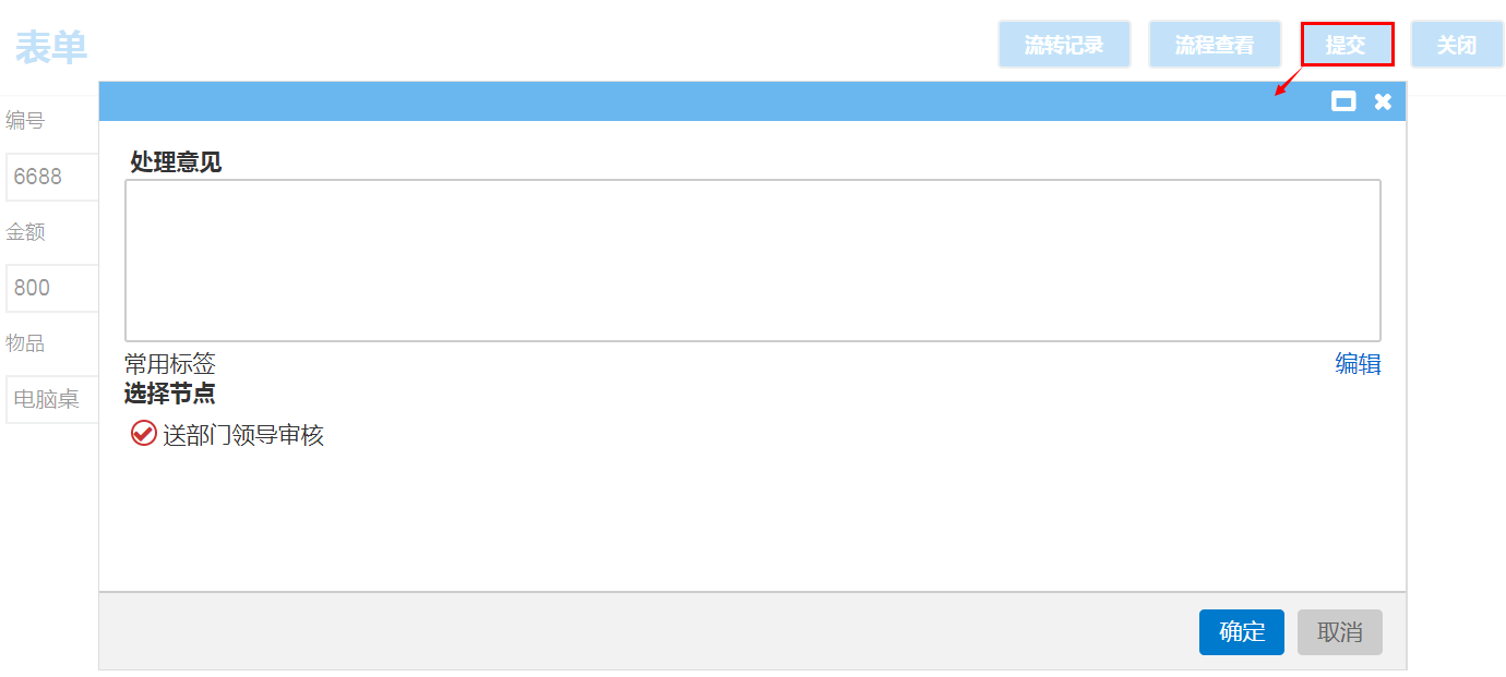 效果如下:登录应用平台,点击窗体进行审核流程,点击【提交】,发送给部门领导审核,如下图: