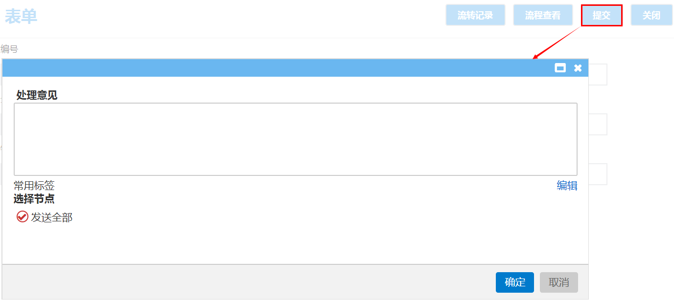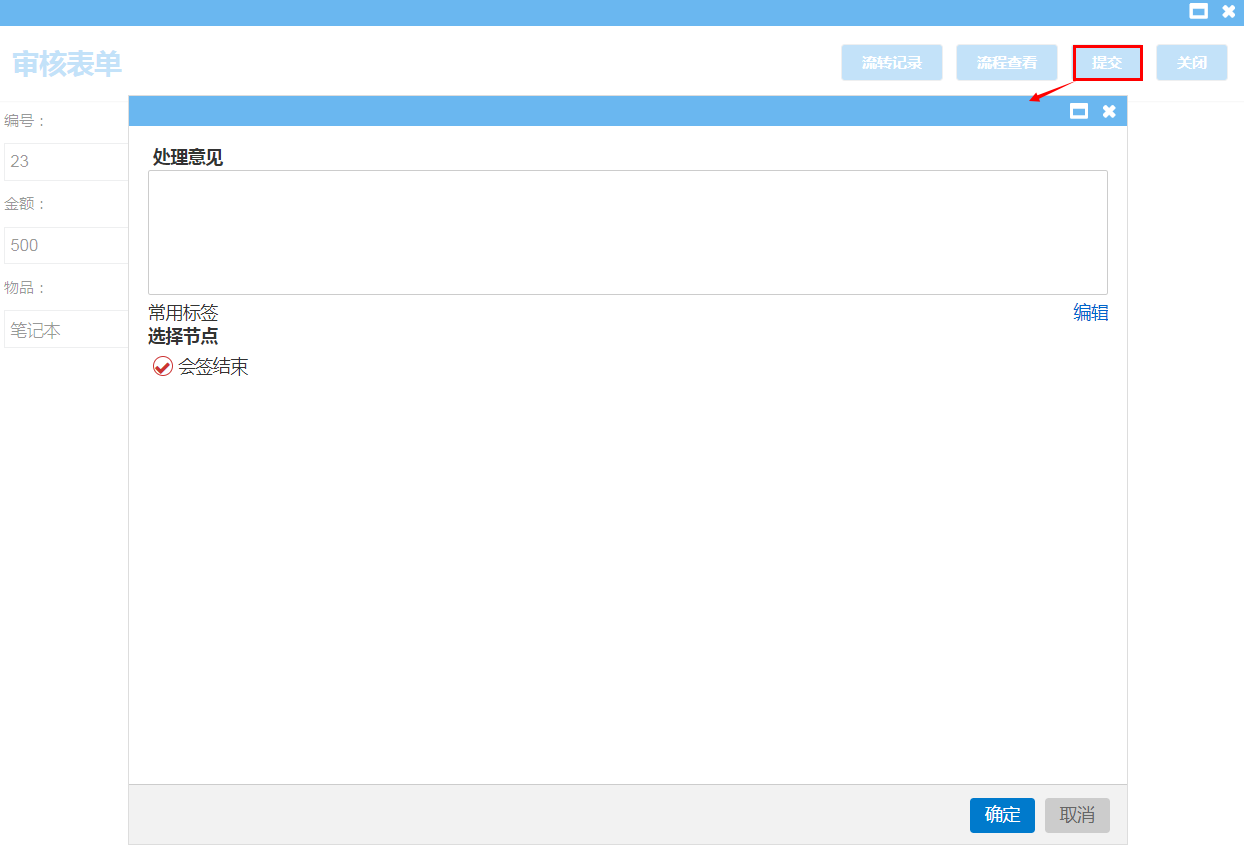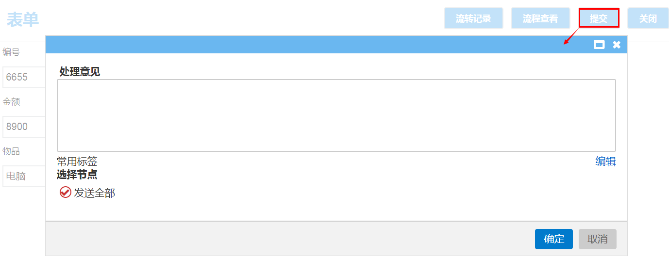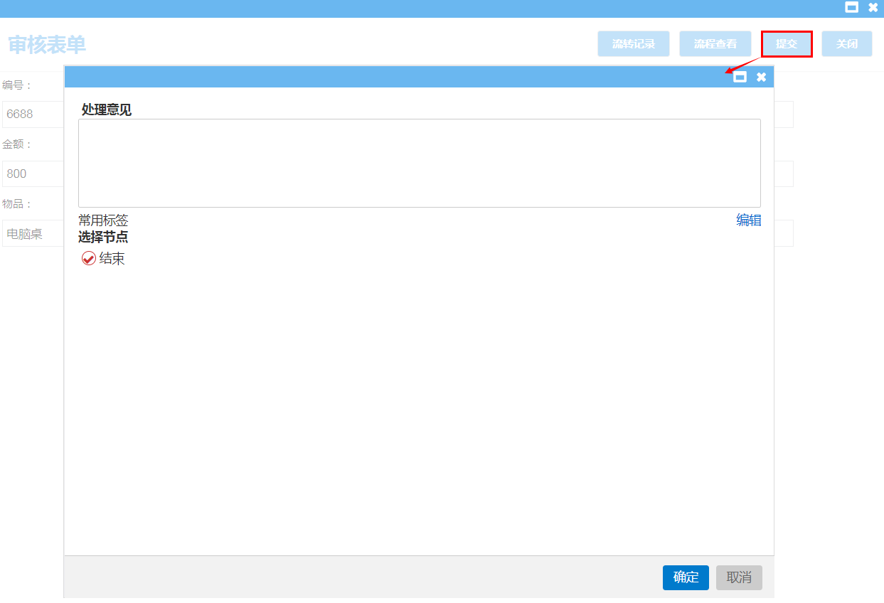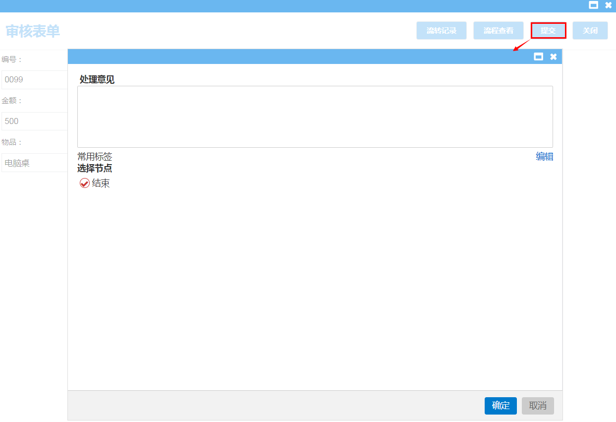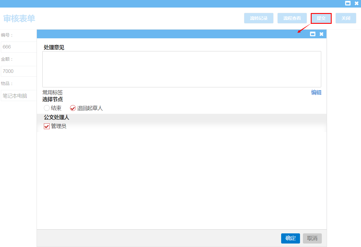 效果如下:登录应用平台,点击窗体进行审核流程,点击【提交】,发送给部门领导审核,如下图: