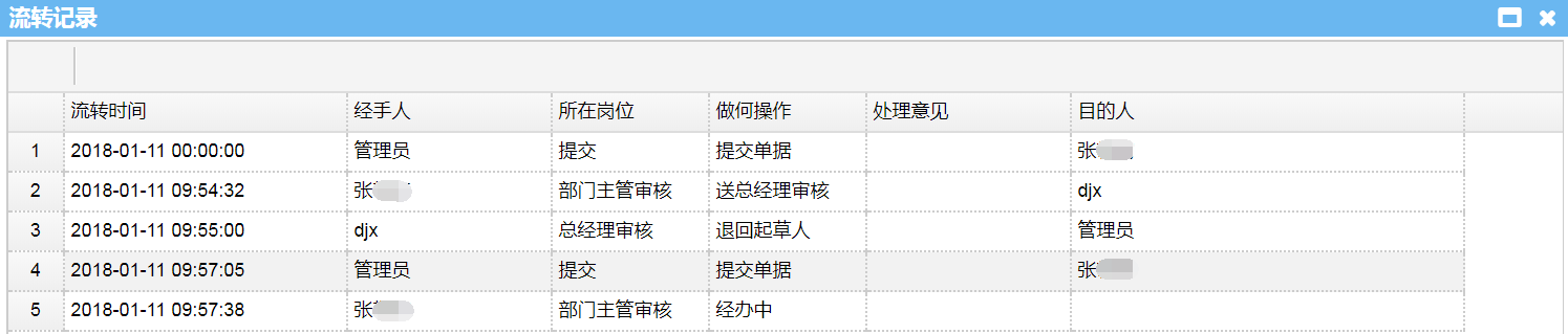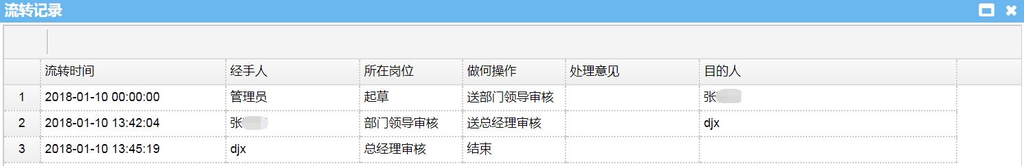 总经理审核人员登录系统后,审核窗体结束流程,点击【流转记录】,查看效果如下图: