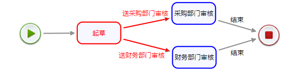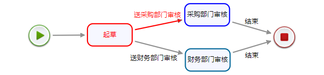 并行分支模式是审批过程中一个审批节点将后续的审批节点同时激活,并准许活动同时执行,当窗体起草后,同时激活【采购部审核】和【财务部审核】两个节点,工作流程效果如下图: