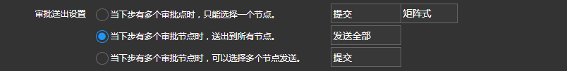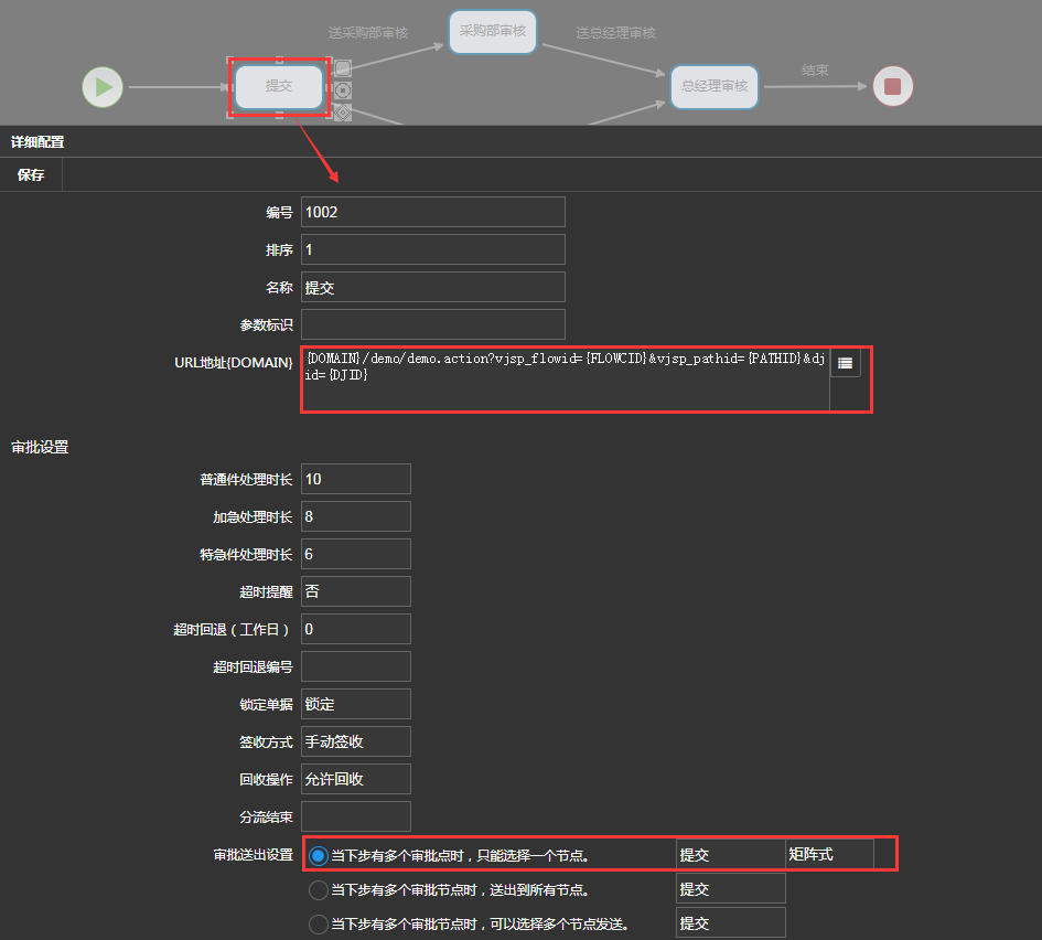 新建流程后,窗体设置绑定流程,进入流程设置页面,点击流程控件拖拽到页面形成流程,双击控件名称,修改名称,右击【提交】人工控件,点击【详细配置】,在详细配置页面,设置URL地址和【审批送出设置】为当下步有多个审批节点时,只能选择一个节点,如下图: