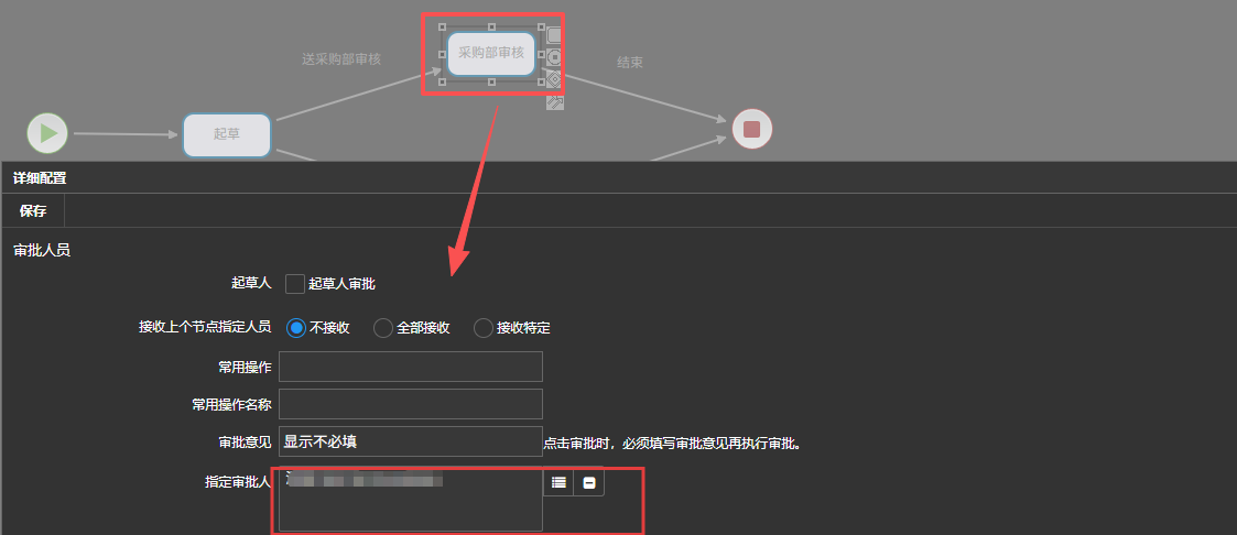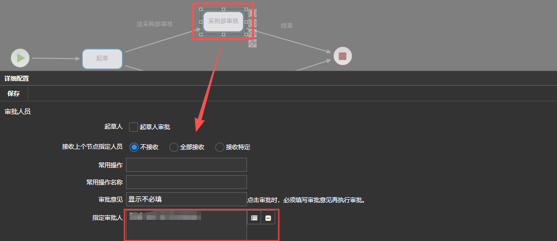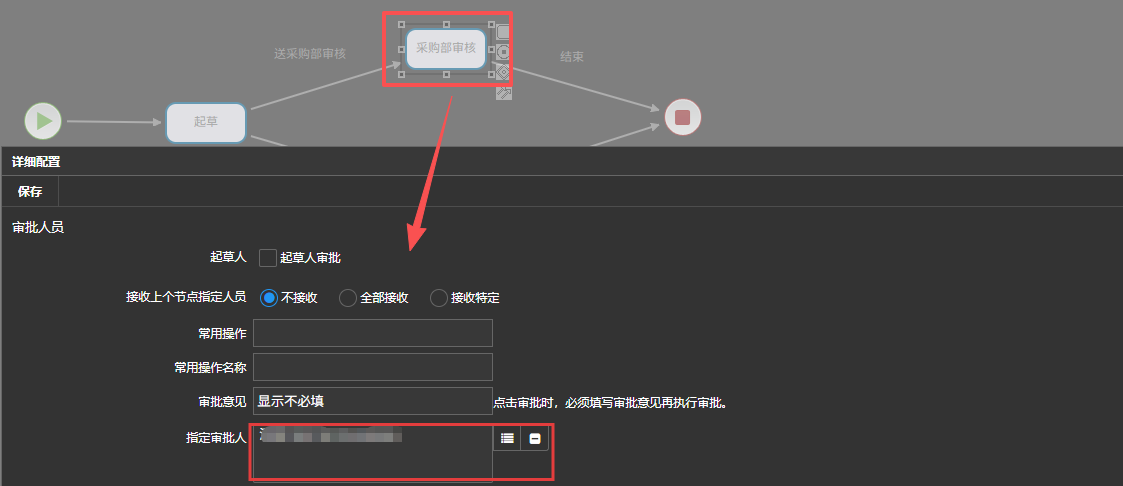 设置【采购部审核】和【财务部审核】节点的审核人员,右击进入详细配置页面,点击【指定审批人】后的按钮,选择审批人,如下图: