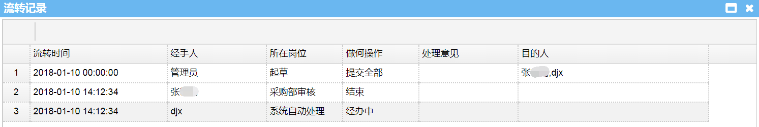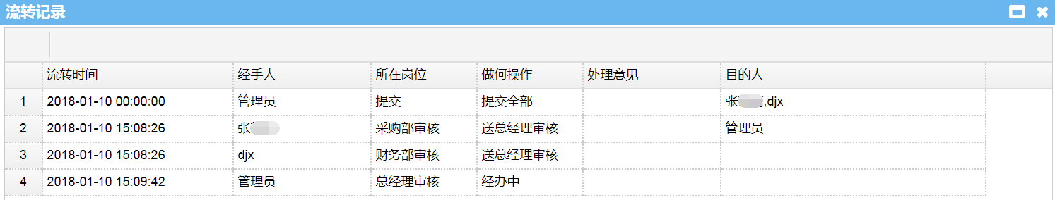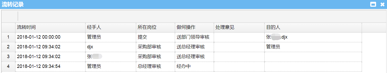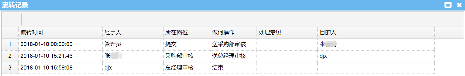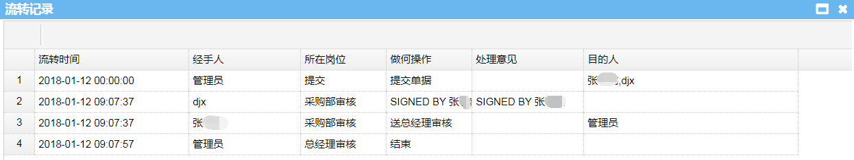 采购部和财务部审核人员登录系统,都审核通过后提交总经理审核,总经理审核人员才会收到审核窗体,点击窗体中【流转记录】,效果如下图: