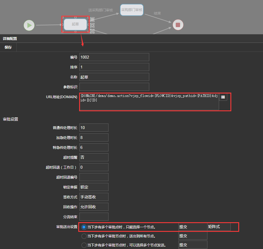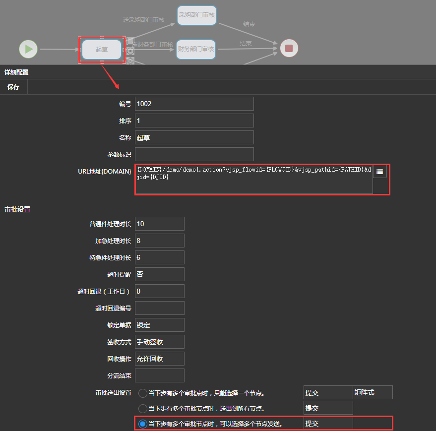 新建流程后,窗体设置绑定流程,进入流程设置页面,点击流程控件拖拽到页面形成流程,双击控件名称,修改名称,右击【起草】人工控件,点击【详细配置】,在详细配置页面,设置URL地址和【审批送出设置】为当下步有多个审批节点时,可以选择多个节点发送,如下图: