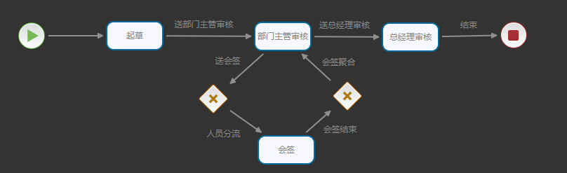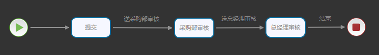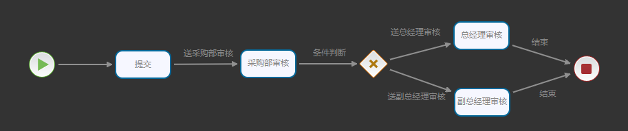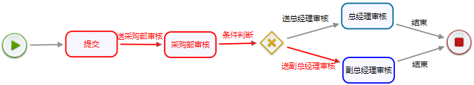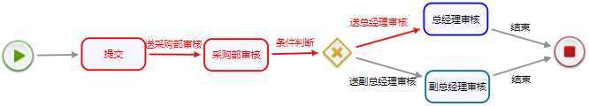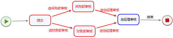 应用案例:流程节点“采购部审核”设置两位审批人,只有两人审核通过后,流程才能到达“总经理审核”节点,审核后结束流程,流程如下图: