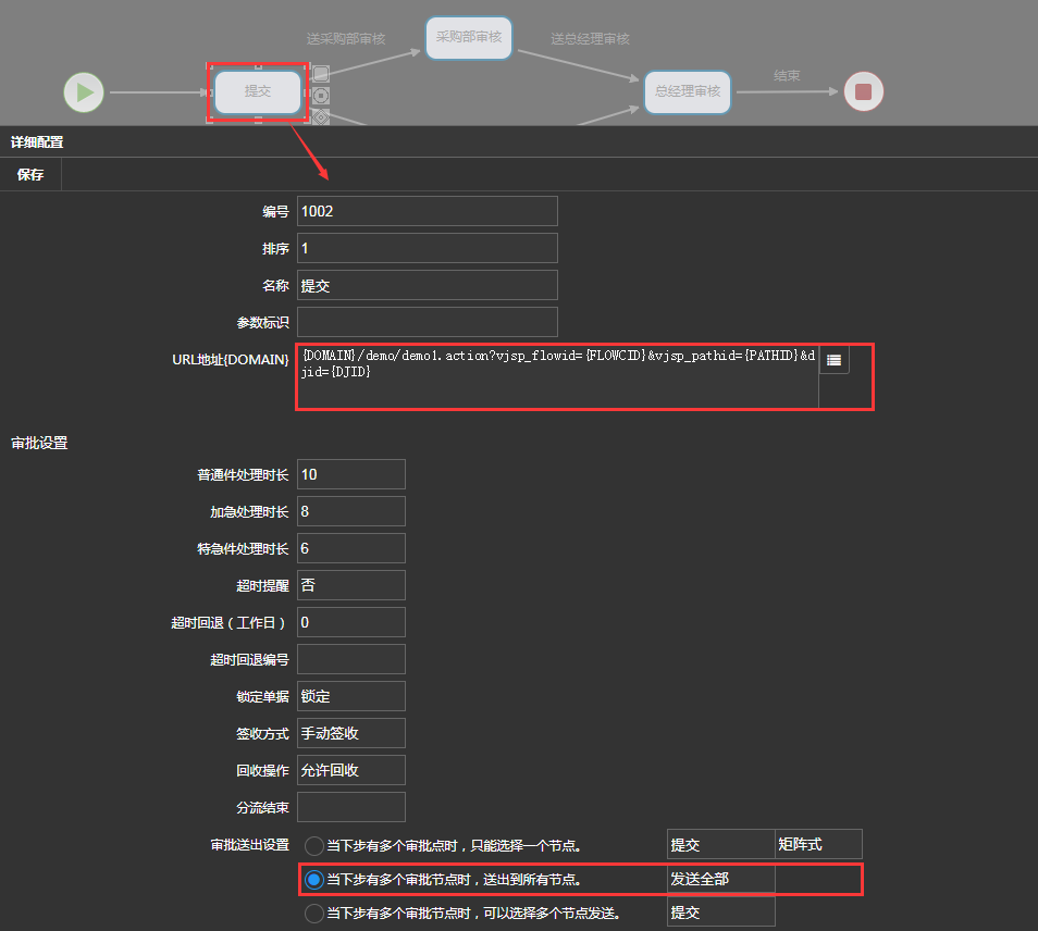 设置流程,在流程设置页面,拖拽流程控件形成顺序模式流程,右击第一个人工控件,点击【详细配置】,进入详细配置页面,修改名称和输入URL地址(其他连线控件和人工控件名称也如此设置),并且设置起草节点的【审批送出设置】为当下步有多个审批节点时,送出到所有节点,如下图: