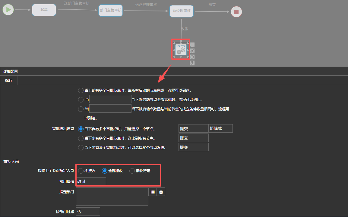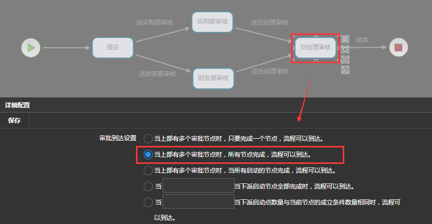 【总经理审核】节点,设置【审批到达设置】当上步有多个审批节点时,所有节点完成,流程可以到达,如下图:
