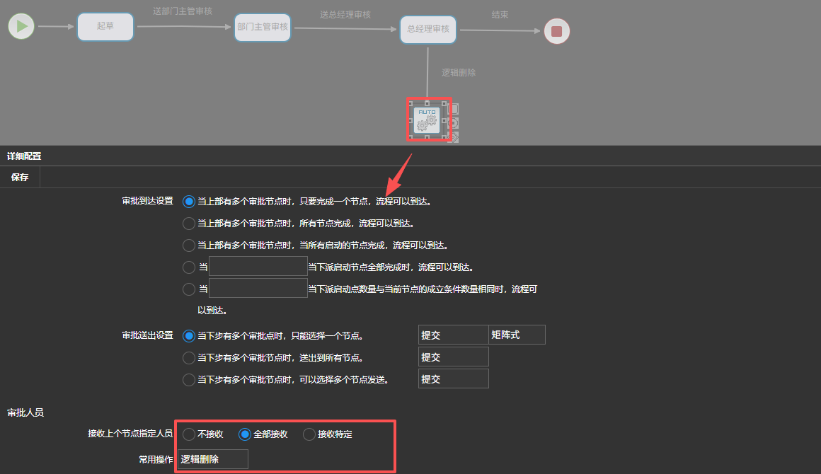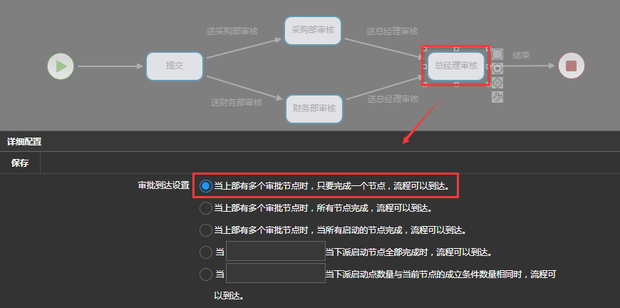 【总经理审核】节点,设置【审批到达设置】当上步有多个审批节点时,只要完成任一节点,流程可以到达,如下图