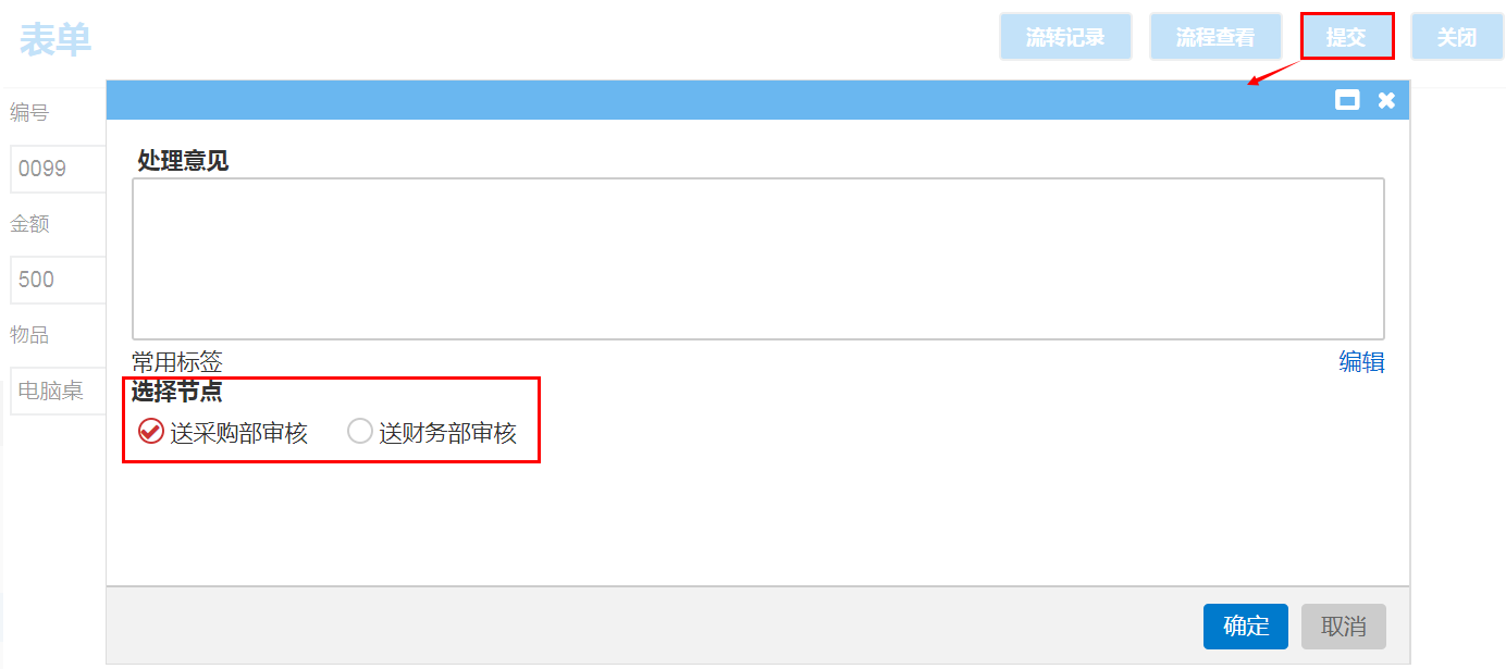 效果如下:登录应用平台,点击窗体进行审核流程,起草人提交审核窗体时,只能从采购部审核和财务部审核两个审批节点选择其中一个节点,如下图:
