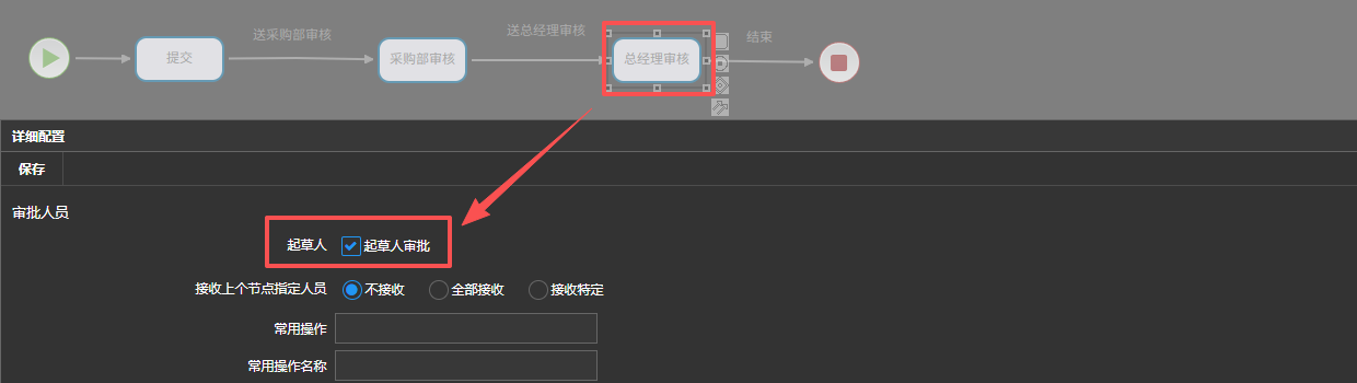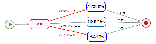 例如:“起草”的时候,选择下一个审批节点到达【采购部审核】和【总经理审核】节点,如下图: