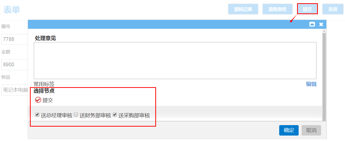 效果如下:登录应用平台,点击窗体进行审核流程,起草人提交审核时,选择发送节点【总经理审核】和【采购部审核】,如下图: