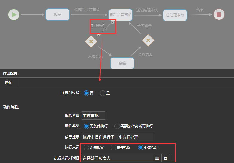 添加“送会签”连线,并在此处设置指定参与会签的人员,如下图: