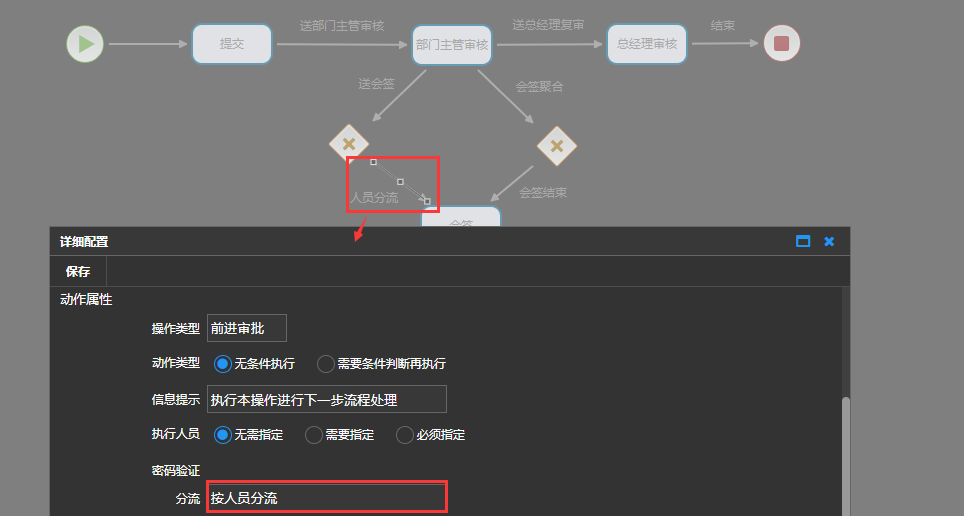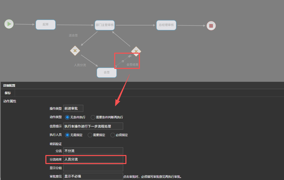 添加“会签结束”连线,将会签后的数据传回“部门主管审核”节点,并且选择人员分流结束,如下图: