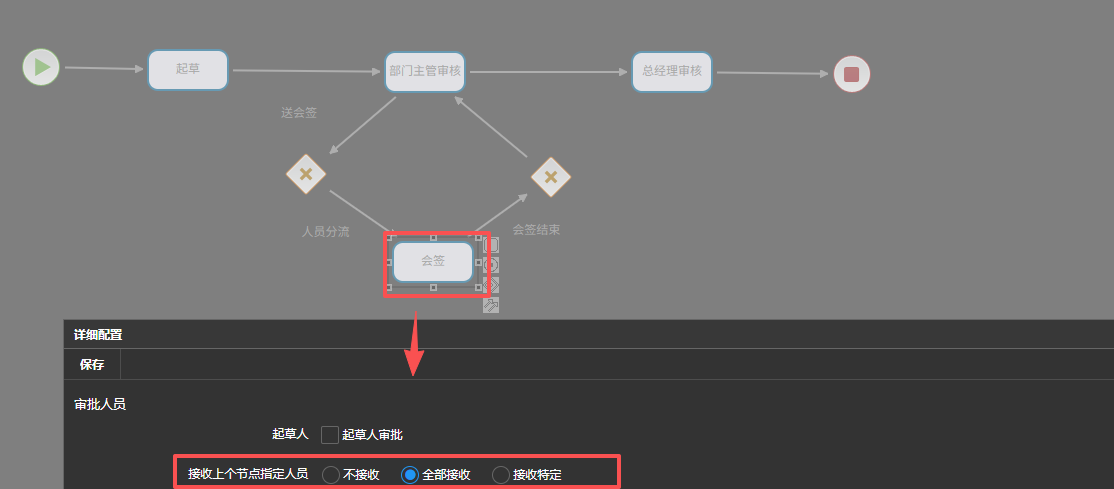 添加“会签”控件,在此处处理会签人员的审批动作,设置当前节点允许接收上一节点指定的人员,如下图: