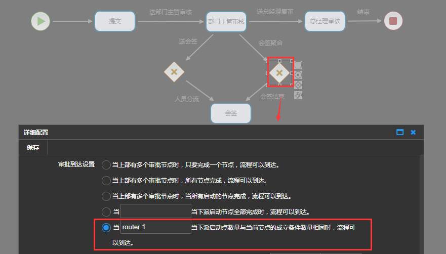 添加路由控件(router 2 )并且针对传到下一节点的数据进行判断,只有全部审批人员都结束审批流程才能到达,设置审批到达设置为,如下图: