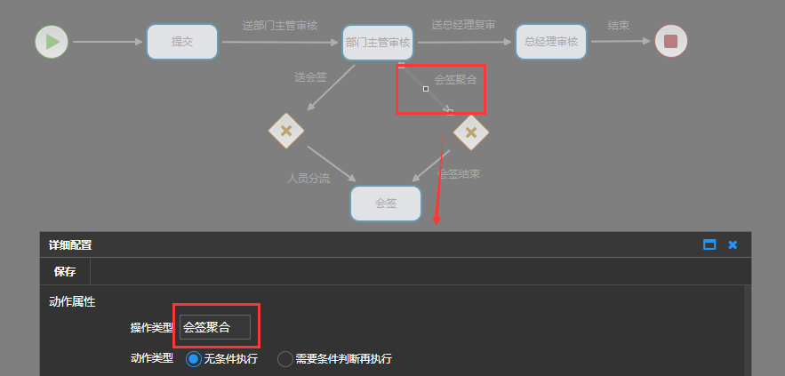 添加“会签聚合”连线,设置操作类型为会签聚合,如下图: