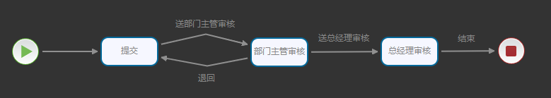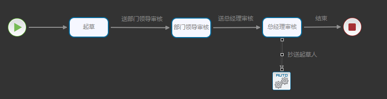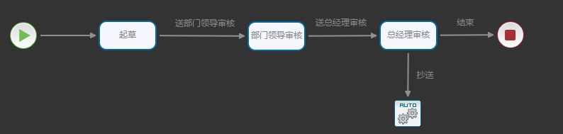 效果如下: 登录应用平台,起草人起草窗体送部门领导审核,部门领导审核人员登录系统后发送总经理审核,总经理审核人员登录系统后结束流程或者抄送给起草人,如下图: